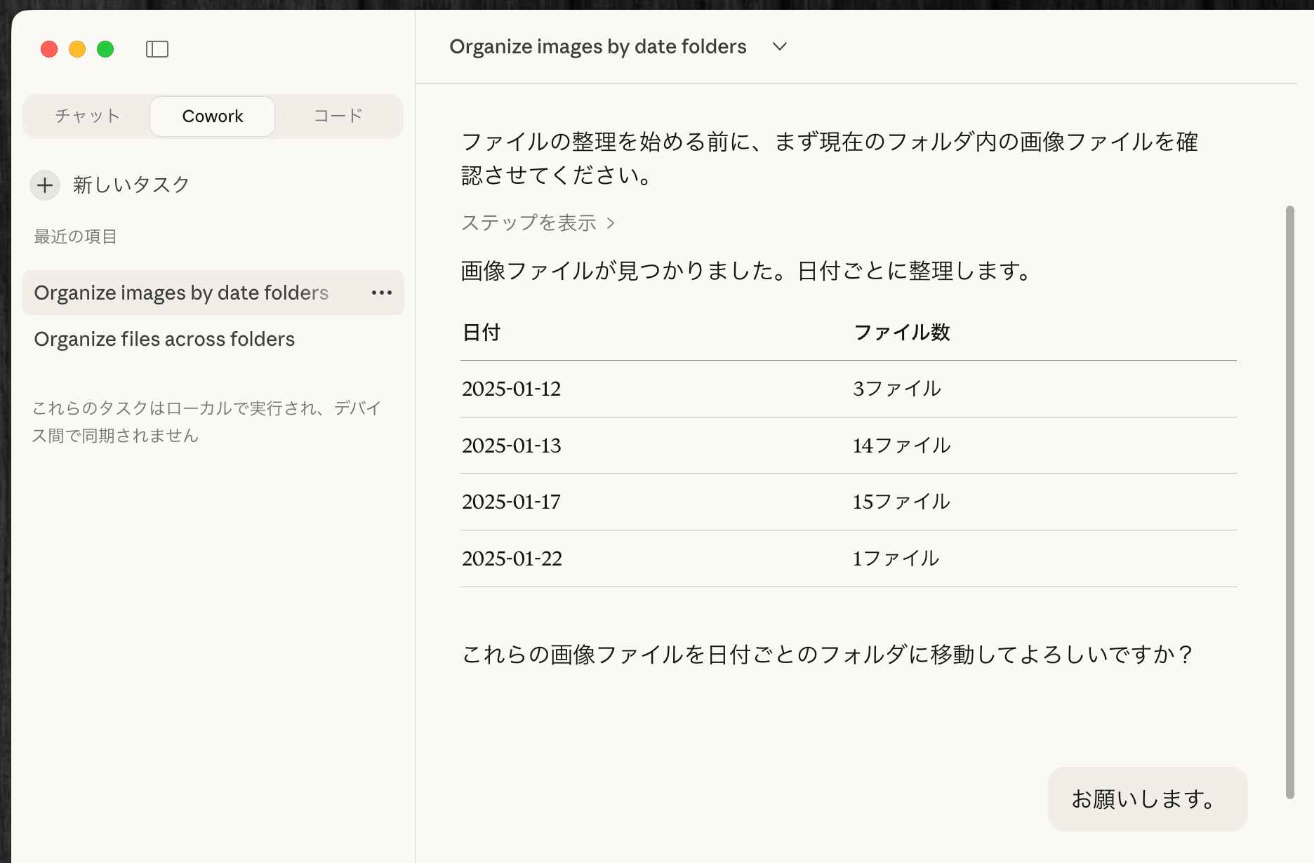 たとえば「やっぱりPDFファイルは別フォルダにまとめて」と指示すれば、Claudeは現在の作業を調整してくれる。