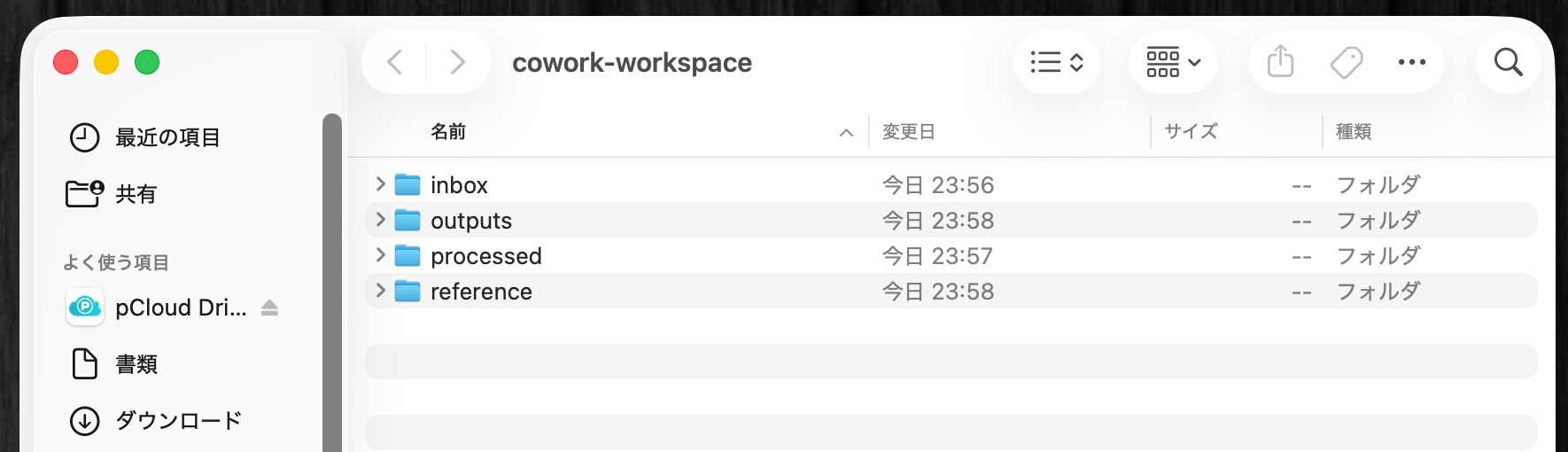 inboxフォルダには処理対象のファイルが入っています。処理が終わったらprocessedに移動してください。新しく作成するファイルはoutputsに保存してください。referenceフォルダは読み取り専用。編集は禁止です。このプロンプトを与えると、Coworkがフォルダ内を探索し、Inboxなどのサブフォルダに何が入っているかを確認してくれる。