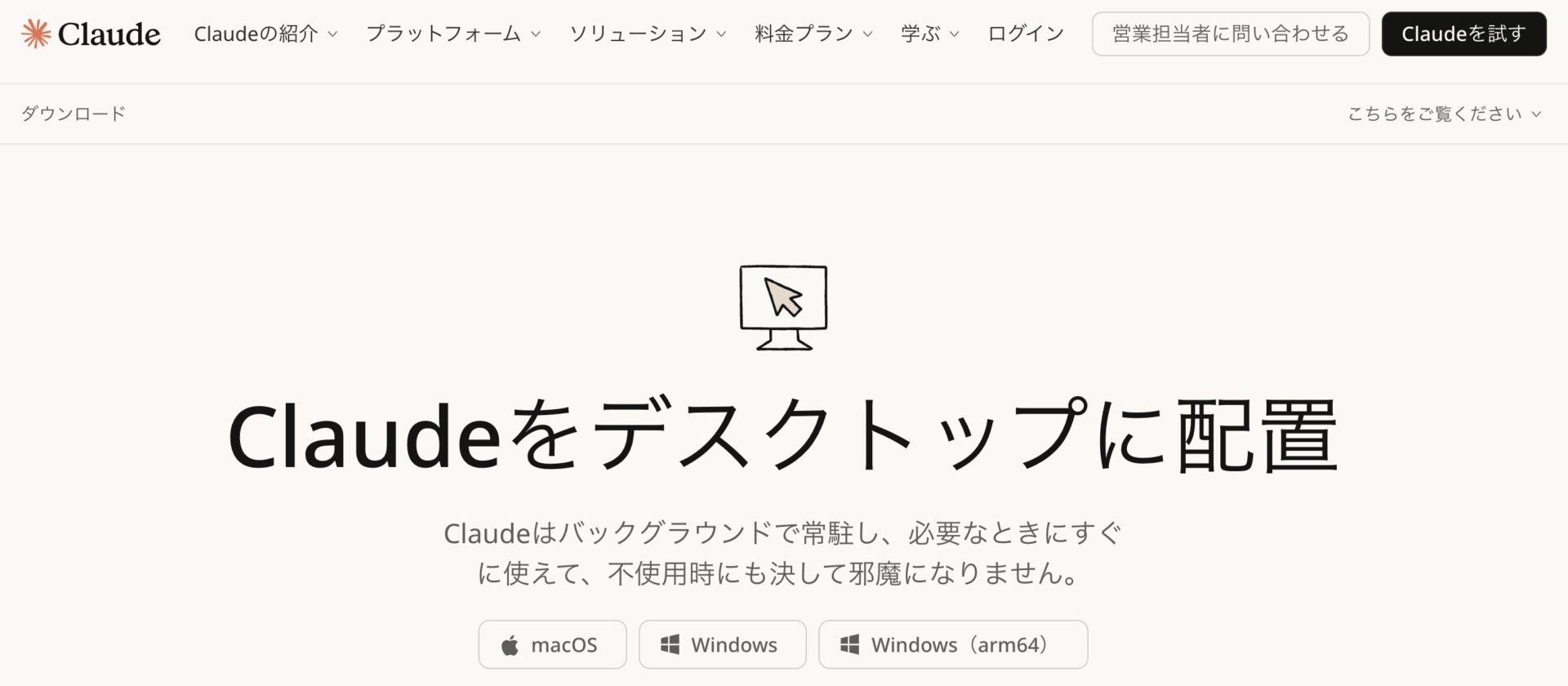 まず、Anthropic公式サイトからClaude Desktopアプリをダウンロードする。