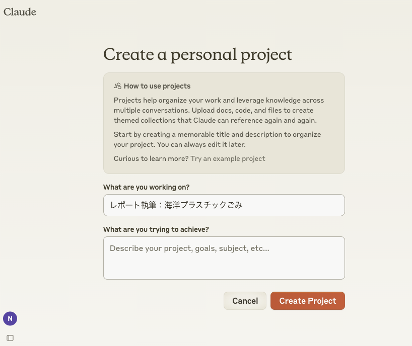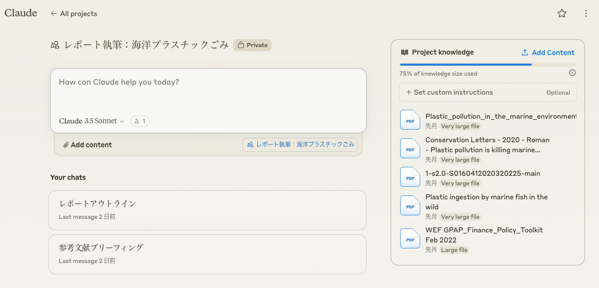 今回は、ビジネスパーソンのリサーチ業務や、大学生のレポート執筆などを想定して、学術論文などを収集してClaudeに読み込ませるプロジェクトを作成する。