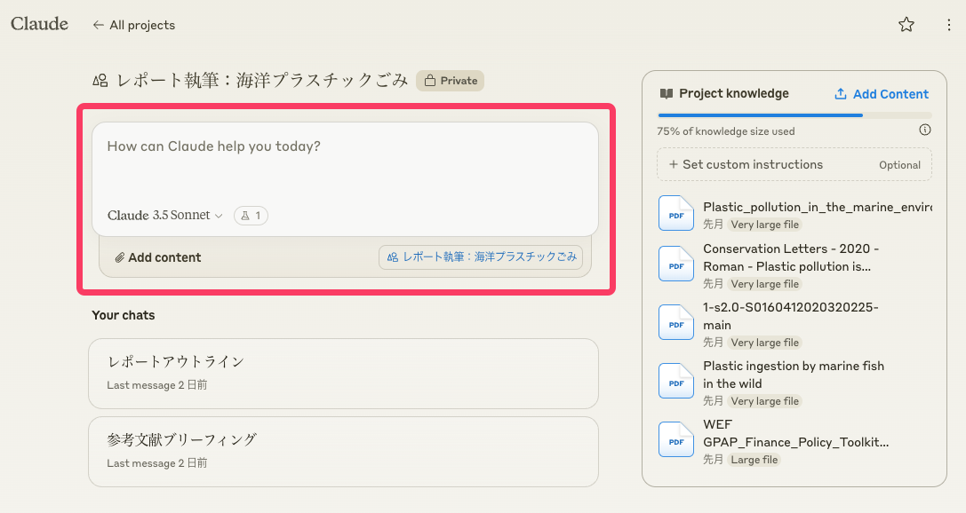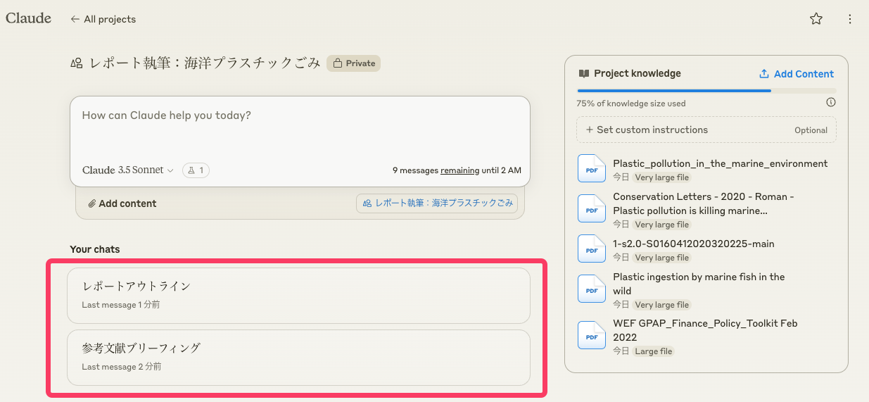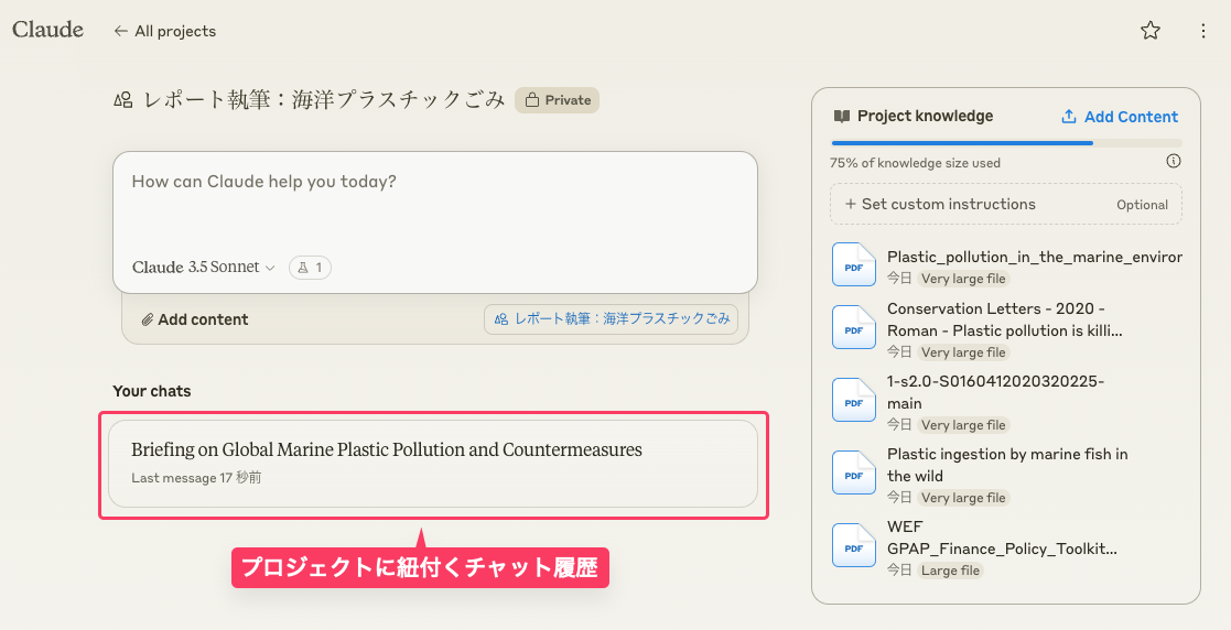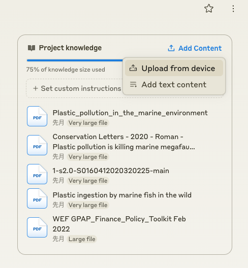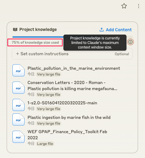 以下の画像で「75% of knowledge size used」と表示されているのは、20万トークンという制限の何割を使い切ったかを示すバーだ。