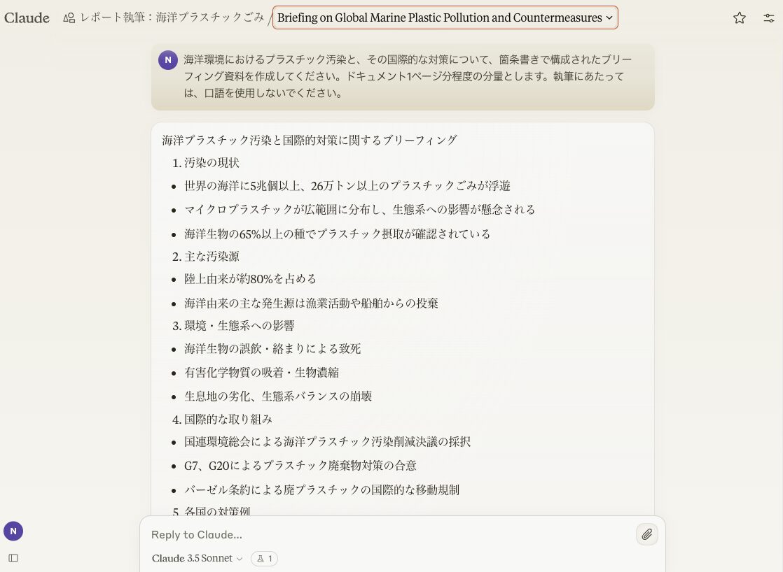 今回の例では、海洋環境に関する学術論文や、世界経済フォーラムのプラスチックに関するレポートなど、長文の英文PDFをナレッジとして与えてみた。