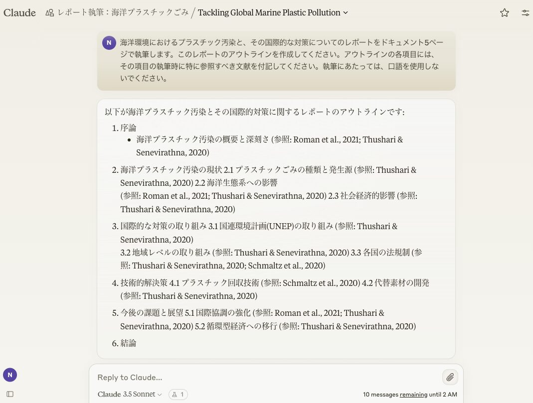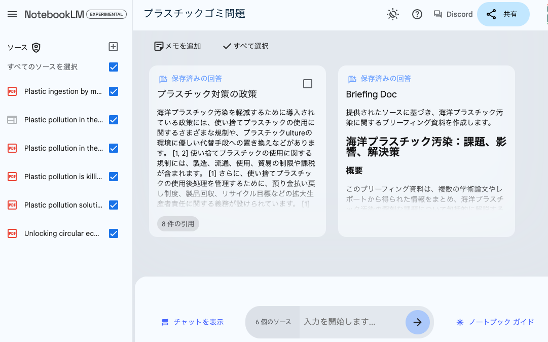 今回は、海洋環境やプラスチックに関する英語の学術論文を多数アップロードしているので、それにまつわるサマリーを頼んでみる。