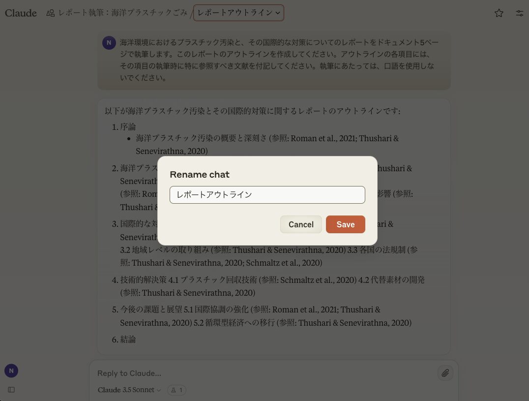 例えば、レポートのアウトラインを作成させたスレッドには、「レポートアウトライン」などと名付ければ、後から見返すのに便利である。