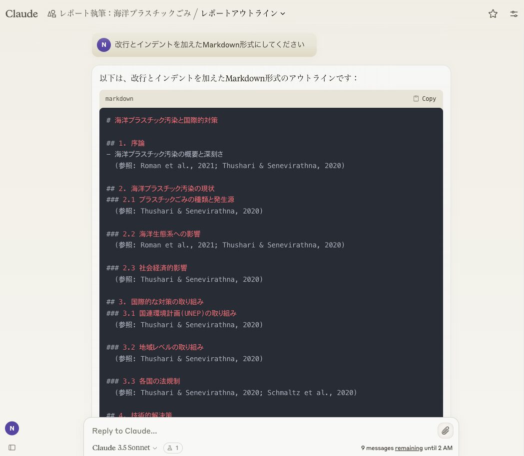例えば、以下のようにレポートのアウトラインを考案させるプロンプトを与える。