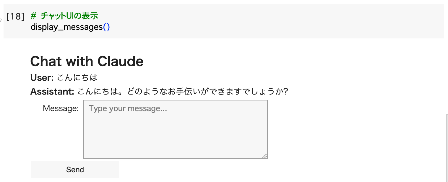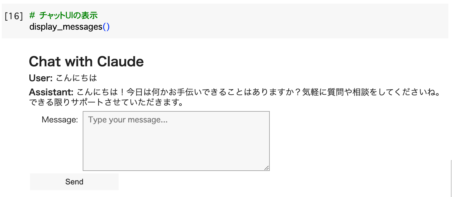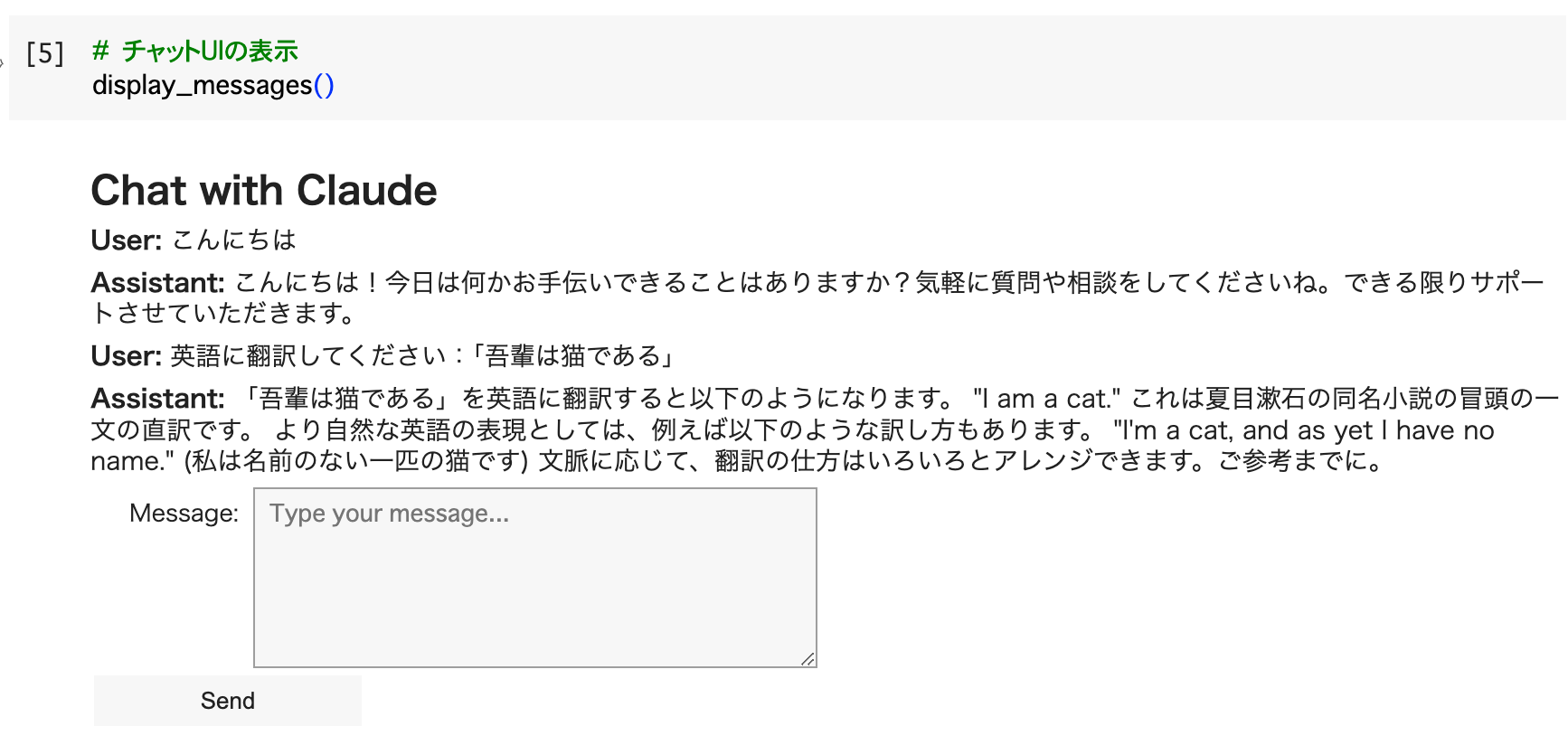 以上でノートブックへのAPIキーの読み込みまでが完了したら、それ以降の見出し「3.使用したいモデルの選択(Opus, Sonnet, Haiku)」「4.Opus, Sonnet, Haikuを呼び出す裏側のコード」「5.Claude 3とのチャットインターフェース」のコードセルを順番に実行していくと、以下のようなチャット用のテキストボックスが表示される。