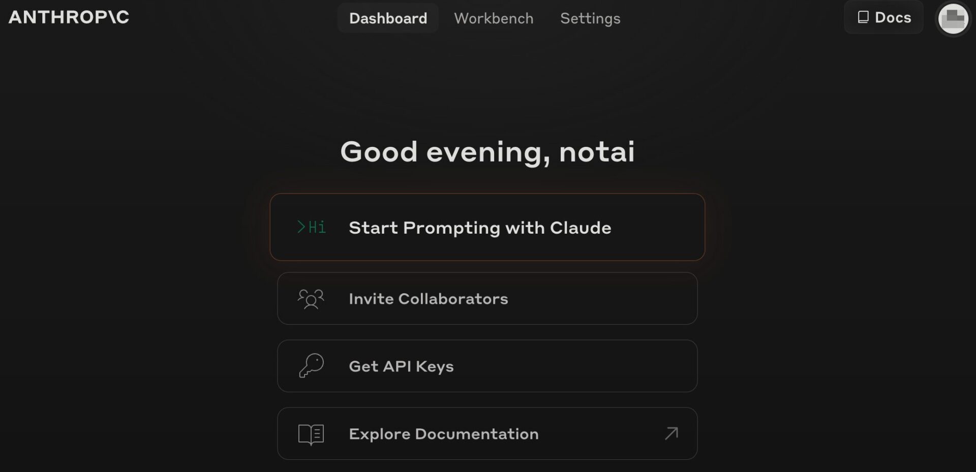 ClaudeのAPIのページにアクセスして、「Get started now」をクリックしてアカウントを作成し、以下のような開発者ダッシュボードにアクセスする。