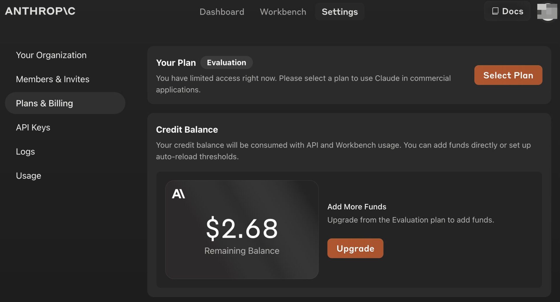 左側のメニューから「Plans & Billing」をクリックすると、現在の利用料のチャージ残高が表示される。
