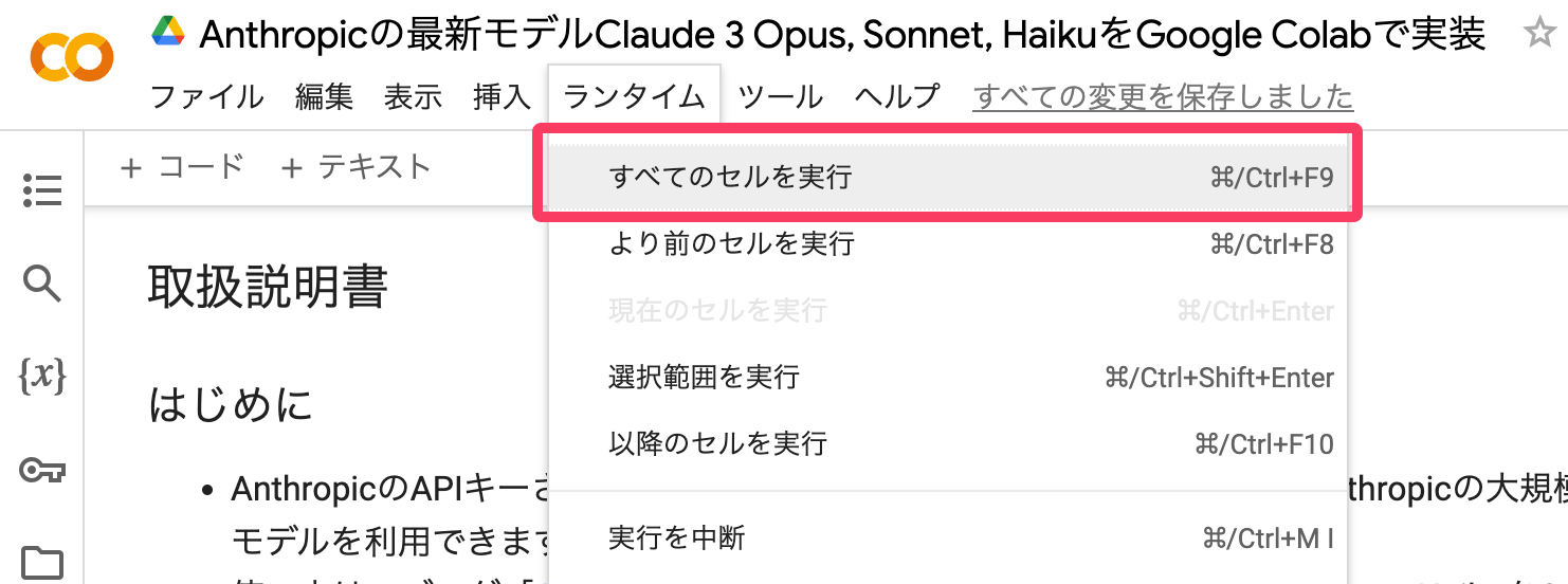 ノートブックを開いたら、上部のメニューから「ランタイム」「すべてのセルを実行」をクリックすれば、勝手に上から順にすべてのコードセルが実行されるので、一番手間がない。