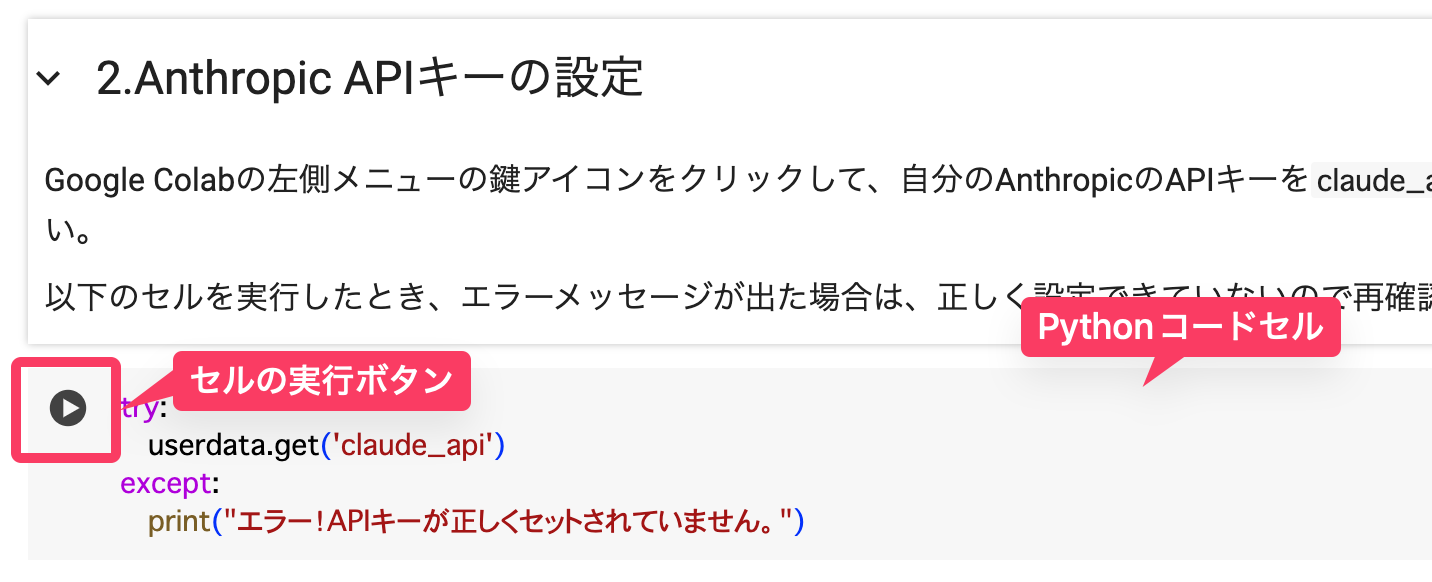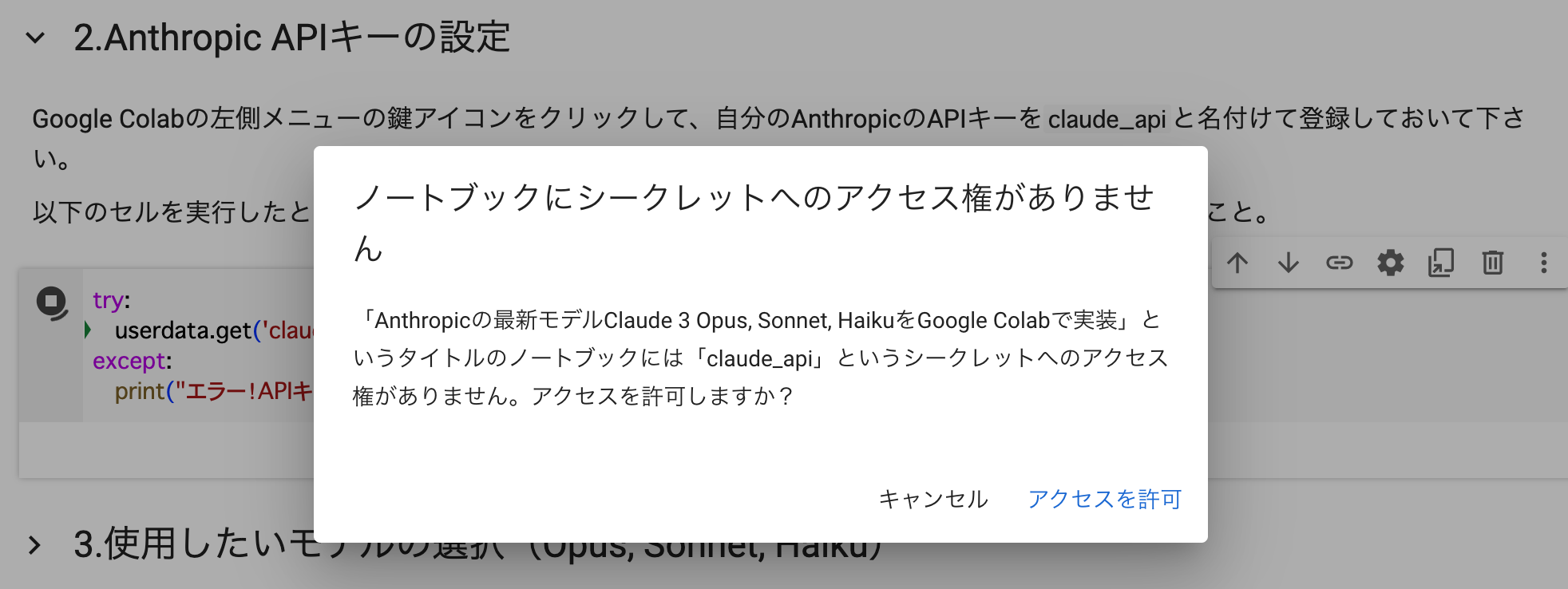 次に、「2.Anthropic APIキーの設定」のコードセルを実行すると、以下のように先にシークレットに登録しておいた自分のAPIキーにアクセスを許可するかどうかを確認されるので、「アクセスを許可」をクリックする。