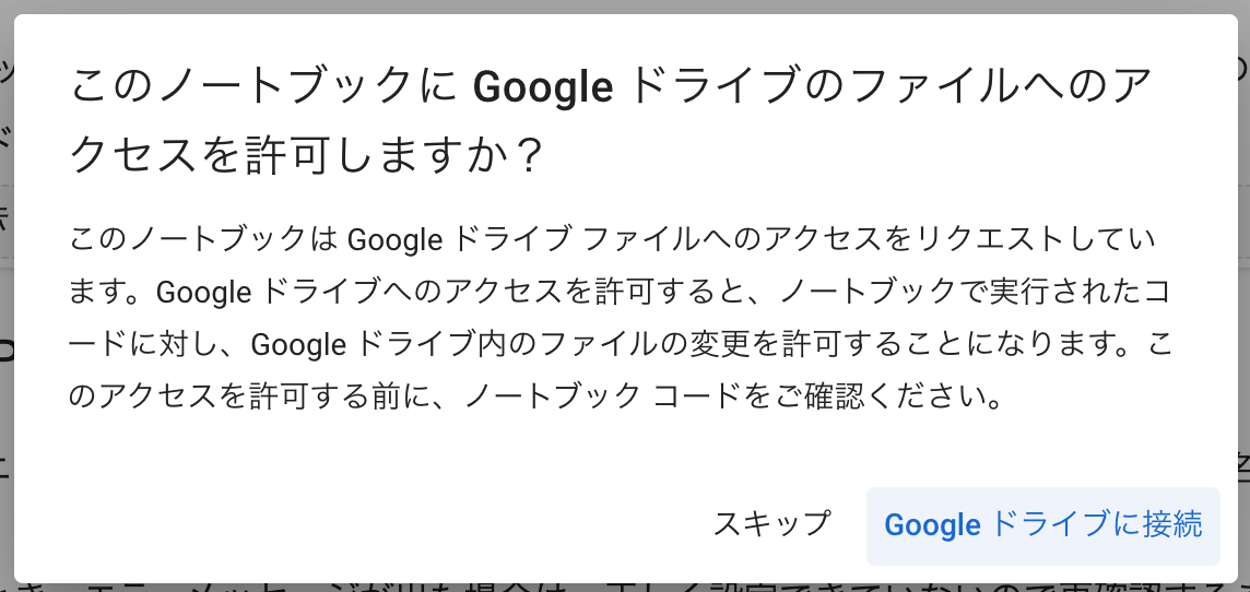 ノートブックの冒頭の「1.必要なパッケージ準備&Googleドライブマウント」のコードセルが実行された時点で、以下のような許諾確認が表示されるので、「このまま実行」をクリックする。