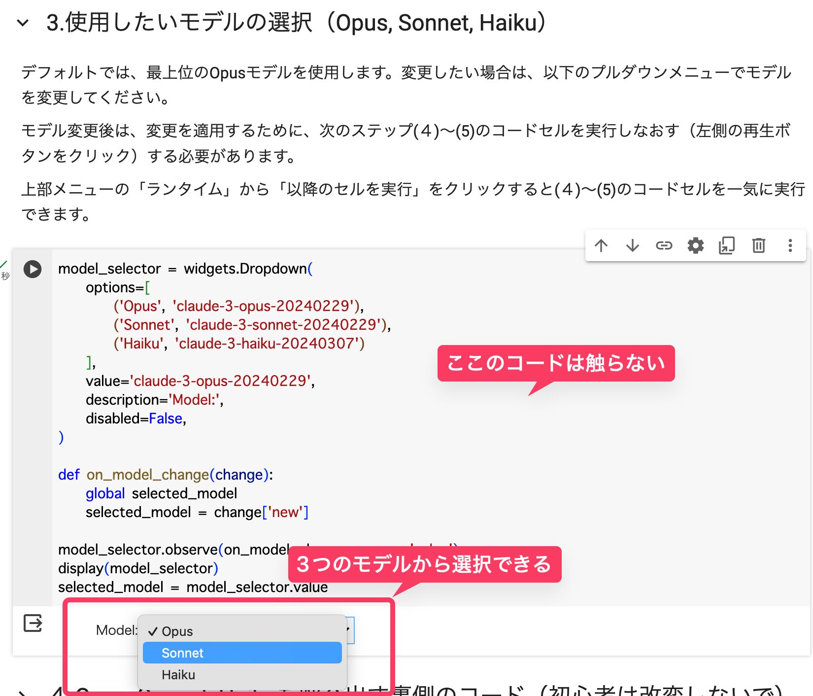 「3.使用したいモデルの選択(Opus, Sonnet, Haiku)」の見出しのコードセルを開くと、下部にあるプルダウンリストでモデルを選択できるようになっている。