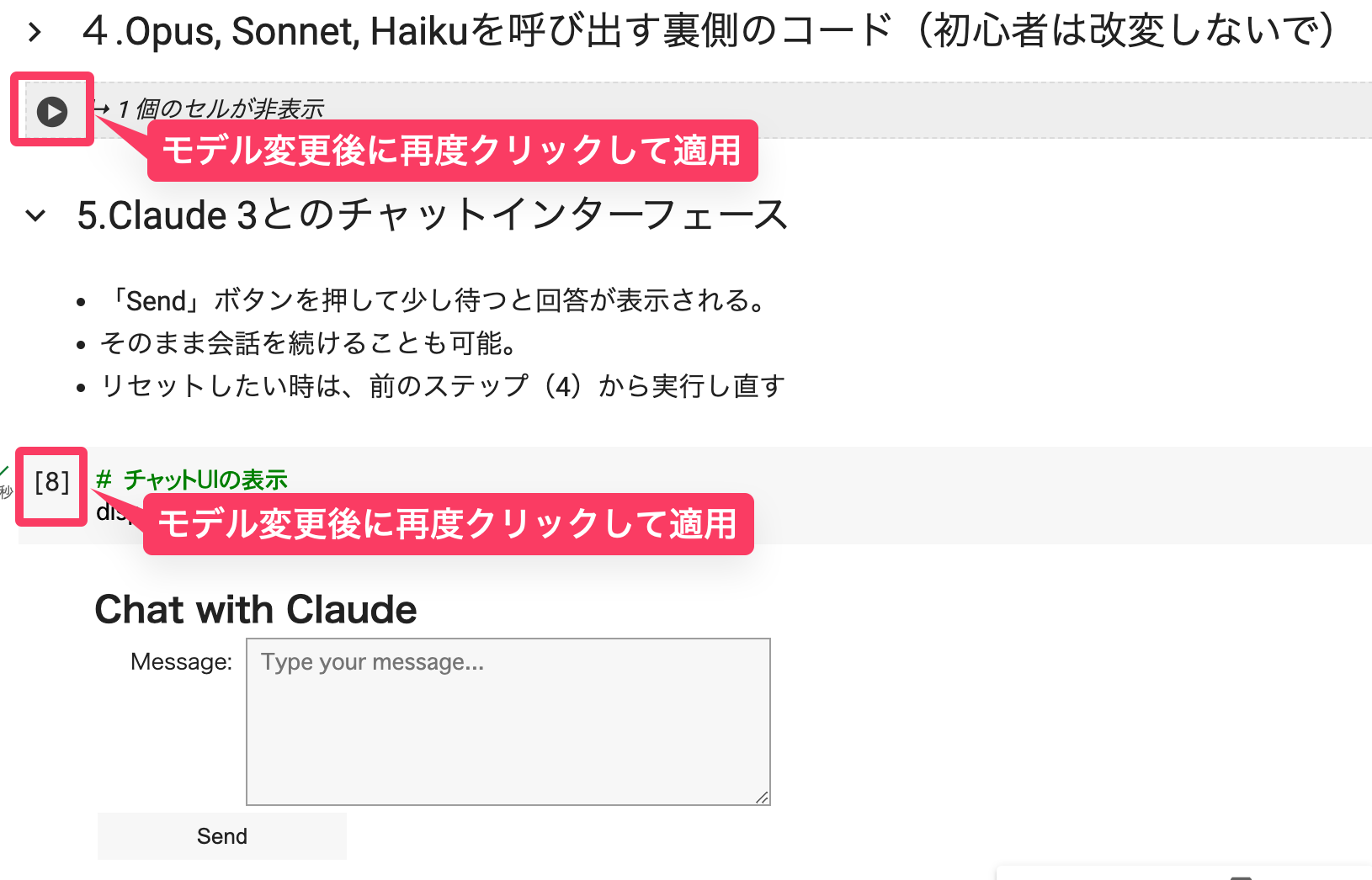 このノートブックを使えば、自分で全くコードを書かずに、Claude 3の各モデルとのチャットを利用することができる。
