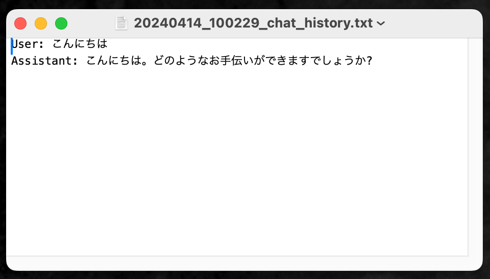 テキストファイルを開いてみると、以下のようにUserとAssistantの会話のやり取りが記録されている。