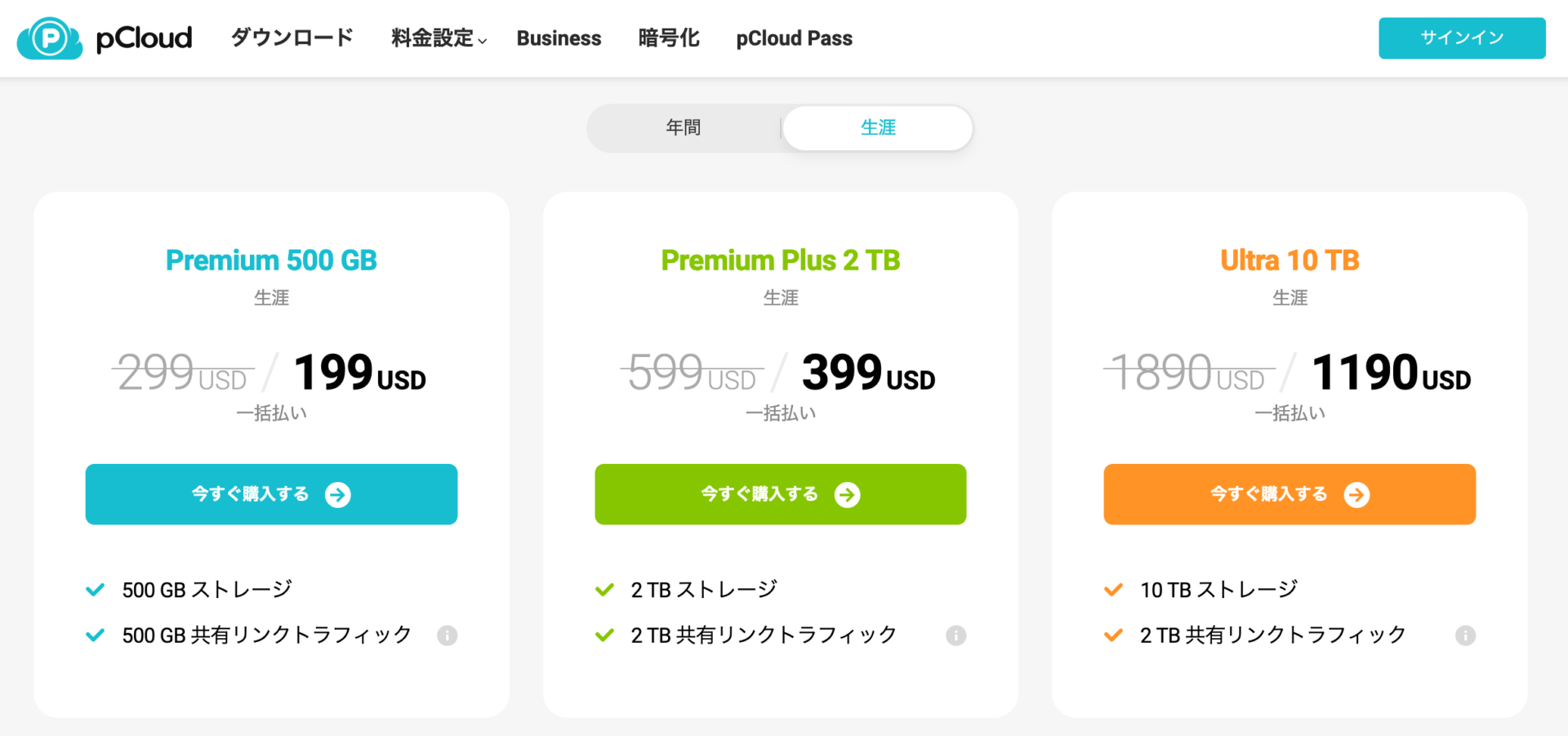 - 貴重なライフタイムプランを提供するクラウドストレージの一つだが、pCloudよりも小さい容量のプラン(100GBなど)が提供されている