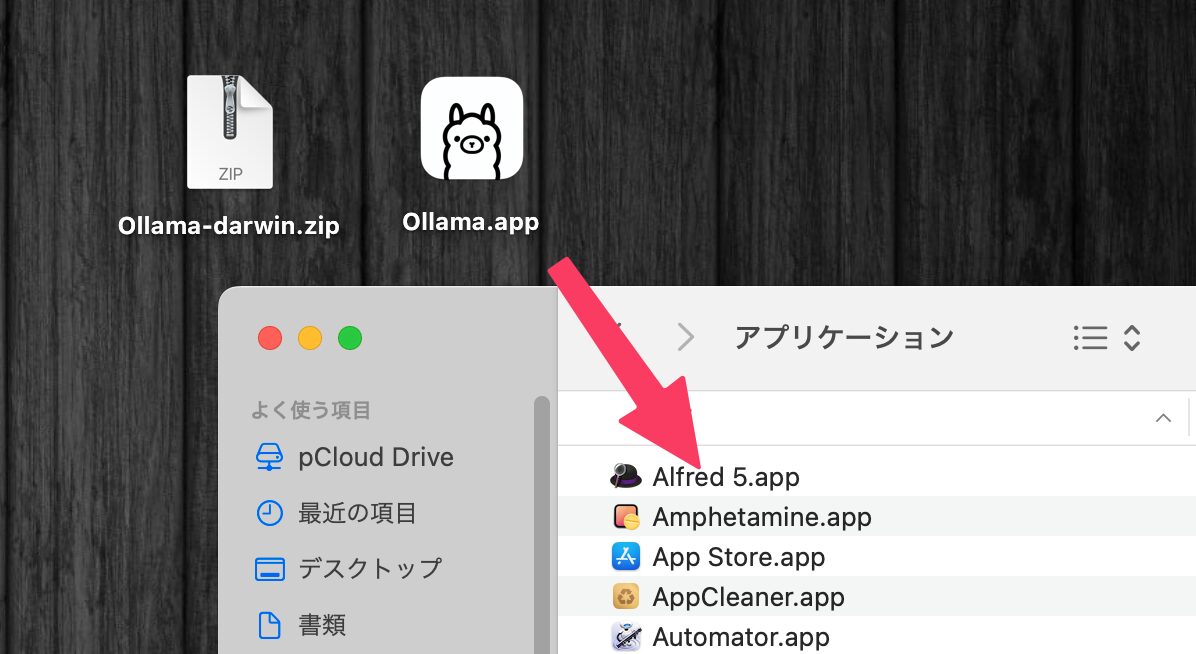 インストール方法を解説すると、たとえばMacの場合ならば、公式サイトからOllamaアプリをダウンロードして.zipファイルを解凍するとOllamaのアプリが出てくるので、それを「アプリケーション」フォルダに移動しておく。