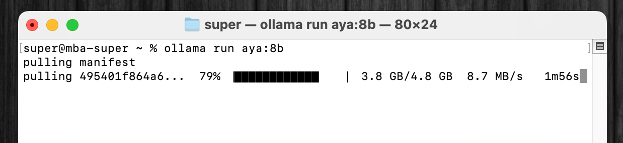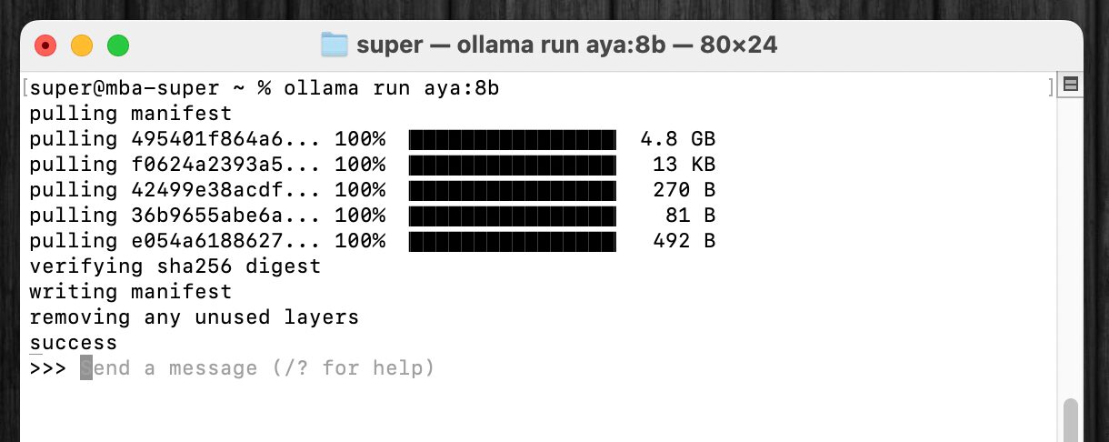 ここで挙げられているモデルであれば、すべて、ターミナルアプリを開いて、ollama run aya:8bのようにollama runコマンドに続けてモデル名を指定するだけで、一発でダウンロードが開始できる。