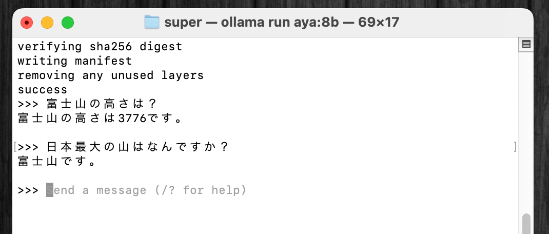 Ollamaのollama runコマンドでのモデルのダウンロードが完了すると、直ちにインストールされ、ターミナル上でAya 23とのチャットが開始される。
