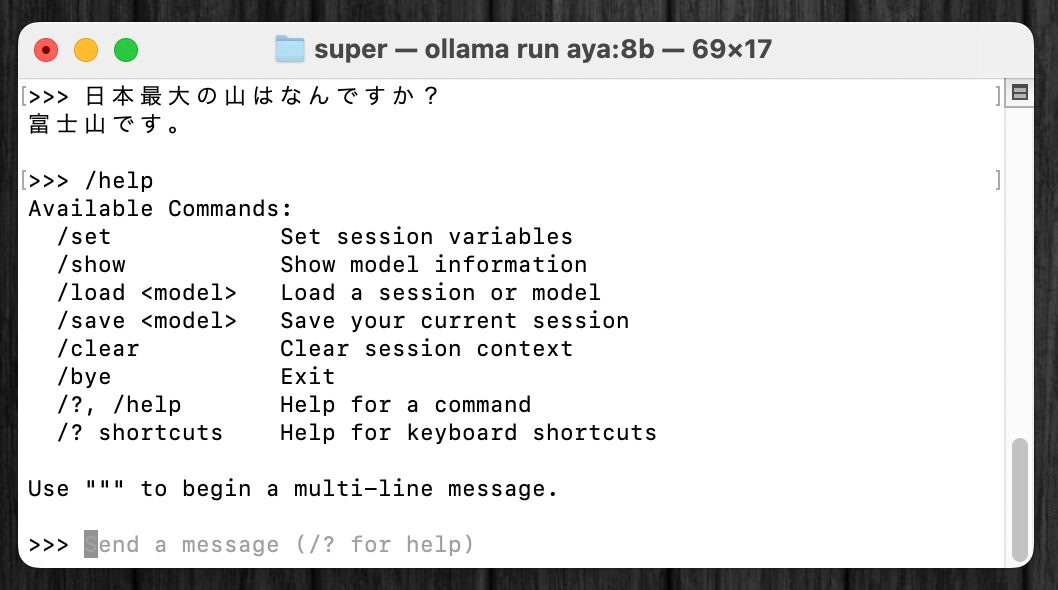 LLMとの会話の途中で、/?と打ち込むと、ターミナル上で利用できるOllamaのコマンド一覧が表示される。