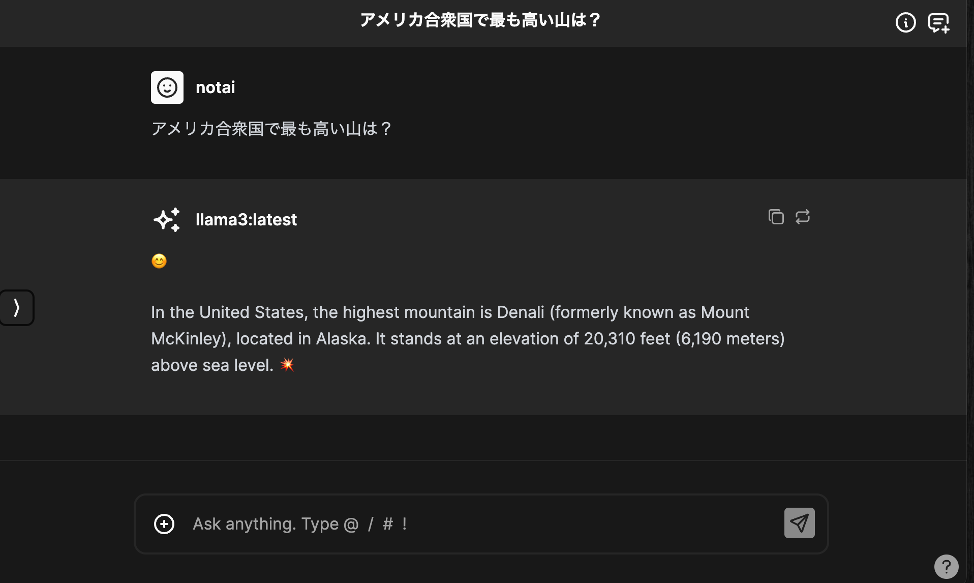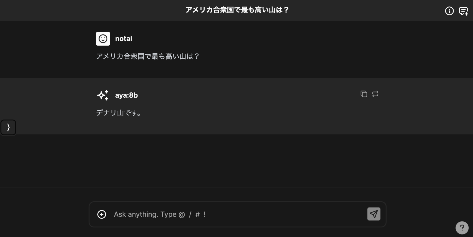 ChatbotUIで、Aya 23に、アメリカで最も高い山を聞いてみたチャットの様子が以下だ。