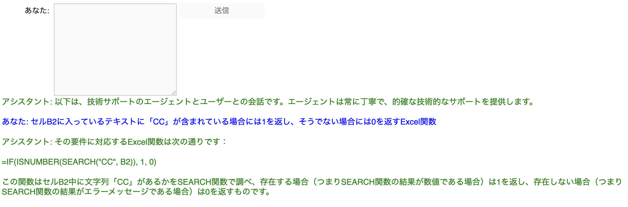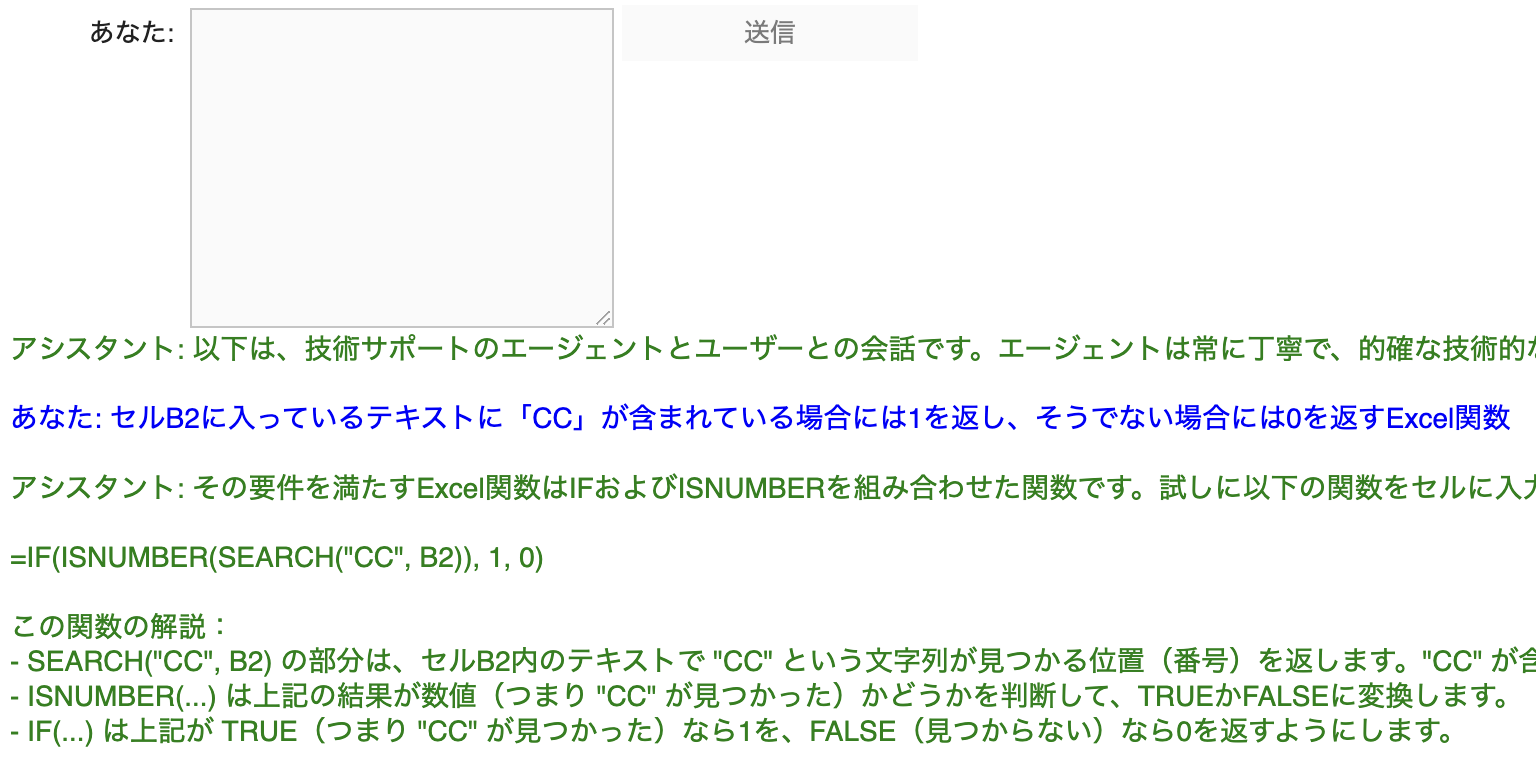 このまま会話を続けたい場合、もう一度テキストボックスに質問を打ち込み、「送信」ボタンを押せば、会話を続けることができる。