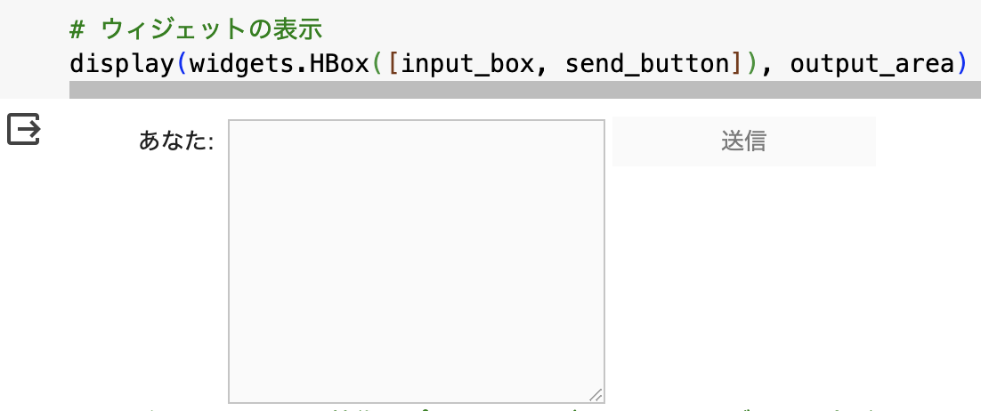 # ユーザーの入力ボックスをクリア input_box.value = ''送信ボタンが押されたときにこの関数を呼び出すイベントハンドラを設定し、ウィジェット(テキストボックス、送信ボタン、アウトプットエリア)を全て表示すると、簡易的なチャットインターフェースが実現できる。