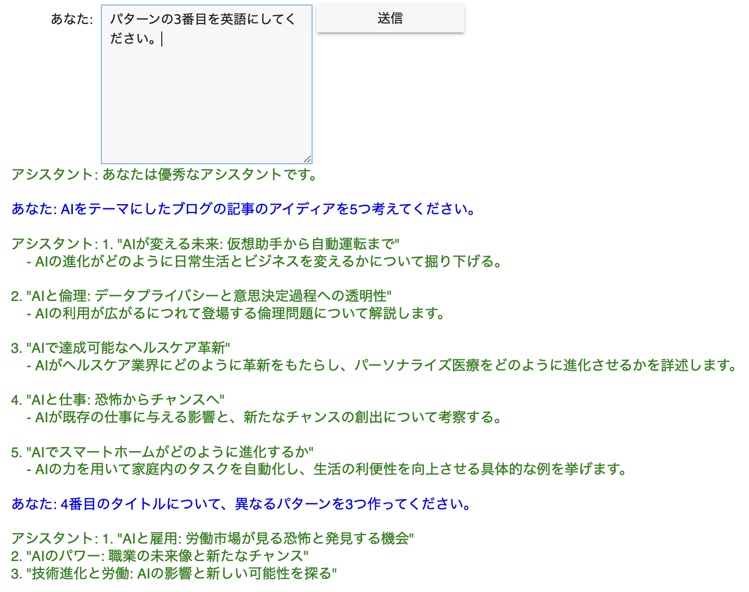 # アウトプットエリアにメッセージを表示 with output_area: clear_output() for message in past_messages: role = 'あなた' if message['role'] == 'user' else 'アシスタント' color = 'blue' if message['role'] == 'user' else 'green' # テキスト内の改行を保持するためにwhite-spaceスタイルを使用 display(HTML(f"<span style='color: {color}; white-space: pre-wrap;'>{role}: {message['content']}</span><br /><br />"))