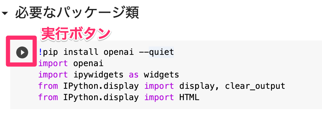 コードブロックを実行するには、各コードブロックの左側に表示される再生マークのようなアイコンをクリックする。
