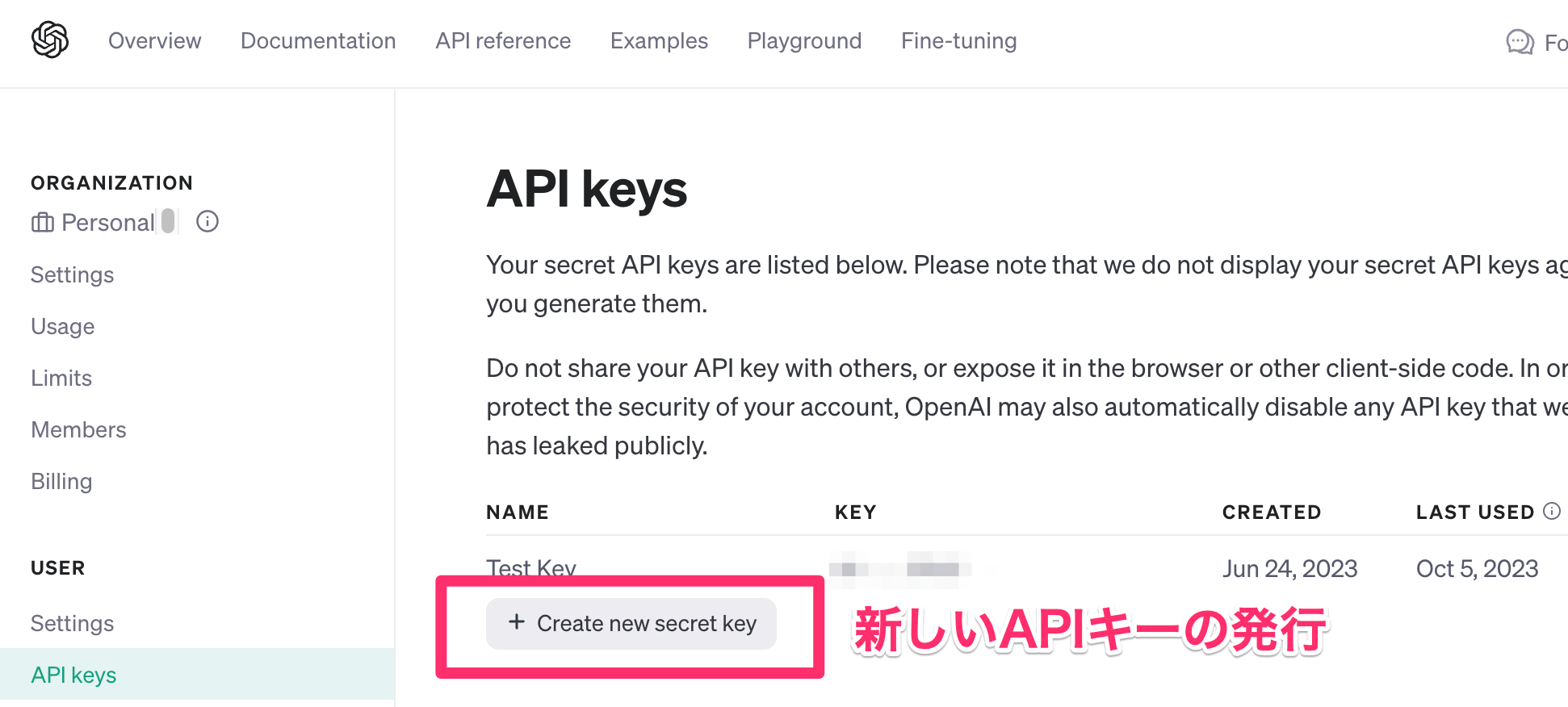 左側から「API keys」メニューを選択し、「Create new secret key」から新しいAPIキーを発行する。