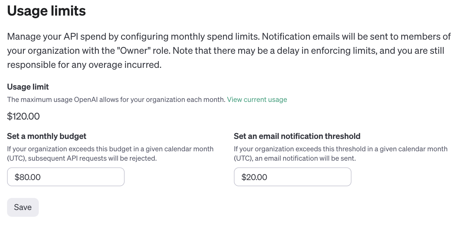 また、APIキーの使用量が予想を超えて、多額の請求が来てしまうリスクが怖い人は、OpenAIのAPIキーを閲覧するページにある「Limits」というメニューから、1ヶ月の最大予算、メール通知をする閾値をそれぞれ設定できるので、確認しておこう。