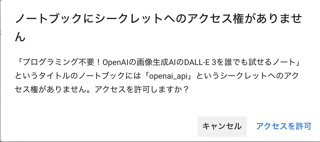 セルを実行するに際して、「シークレット」に保存したあなたのAPIキーへのアクセスを許可するかどうかを尋ねられるので、「アクセスを許可」をクリックする。