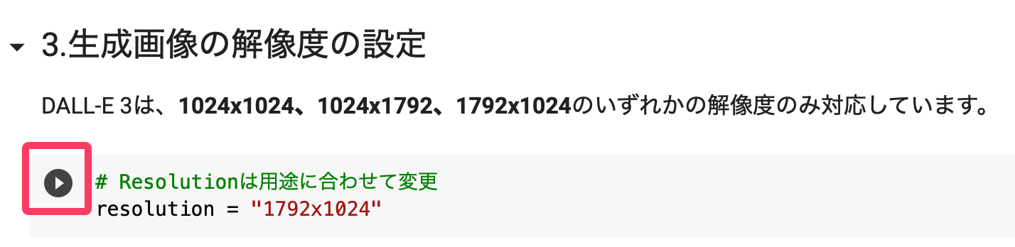 上記のノートブックで、セクション3「生成画像の解像度の設定」がその設定をしている箇所だ。