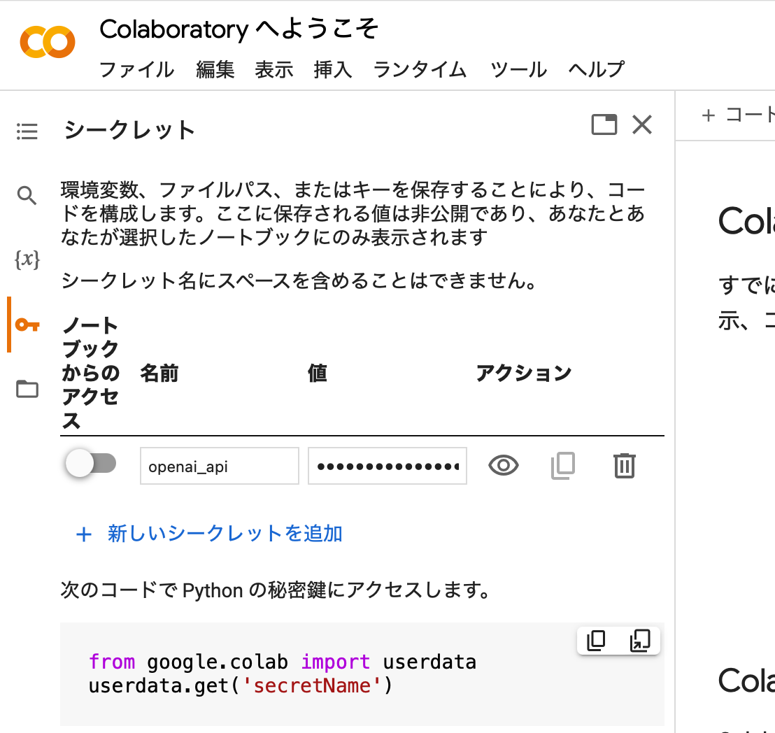 この機能は、最近Google Colabに追加されたばかりの機能だが、他人にコードを教えたり、一々コードの中に自分のAPIキーを書き込むことなく、他の人が作成したノートブック上で自分のAPIキーを呼び出せるので非常に便利だ。