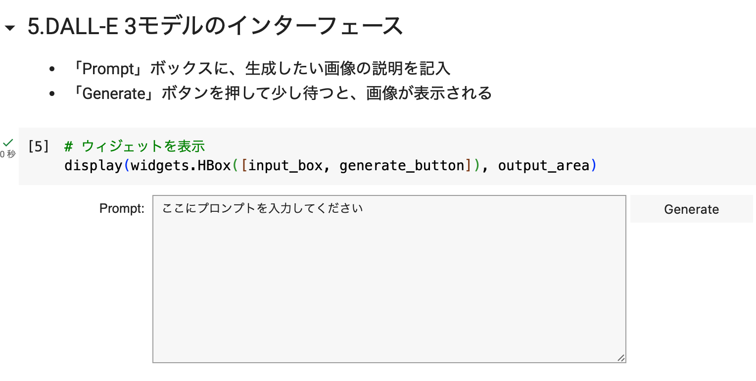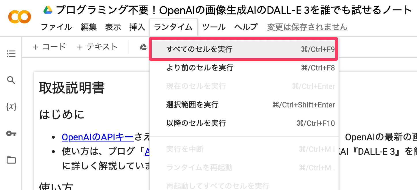 プログラミング不要!OpenAIの画像生成AIのDALL-E 3を誰でも試せるノートAPIキーを、上述の方法で登録さえしておけば、上部のメニューの「ランタイム」-「全てのセルを実行」するだけで、DALL-E 3に画像生成のプロンプトを指示できるテキストボックスが表示されるようになっている。