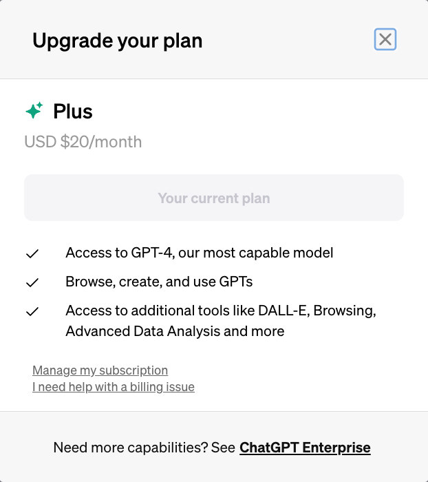 月額20ドルだが、最新のテキスト生成モデルであるGPT-4が使えたり、DALL-E 3による画像生成や、BingによるWEB検索まで利用可能になるので、登録して損はないはずだ。