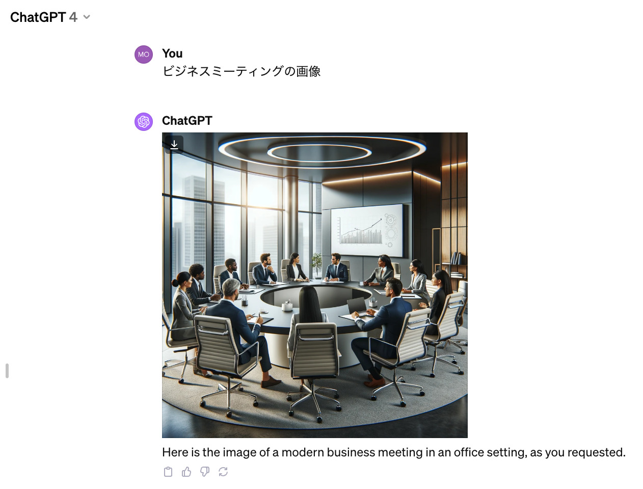 実際に「ビジネスミーティングの画像」とだけ指示してみたところ、次のような大企業でのミーティングの様子が描かれたイラストが出てきた。