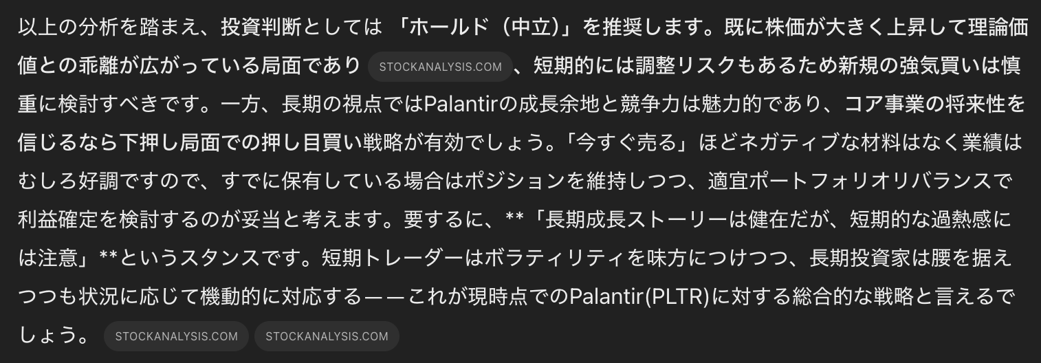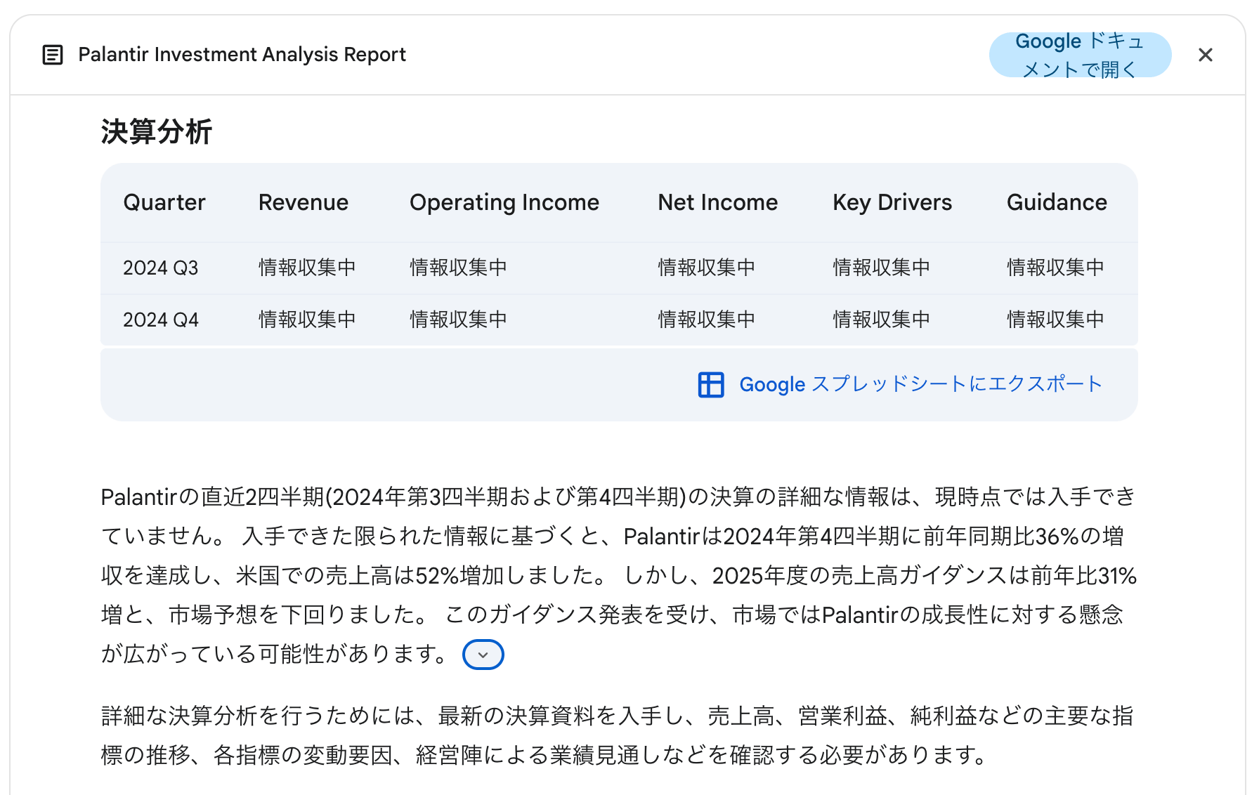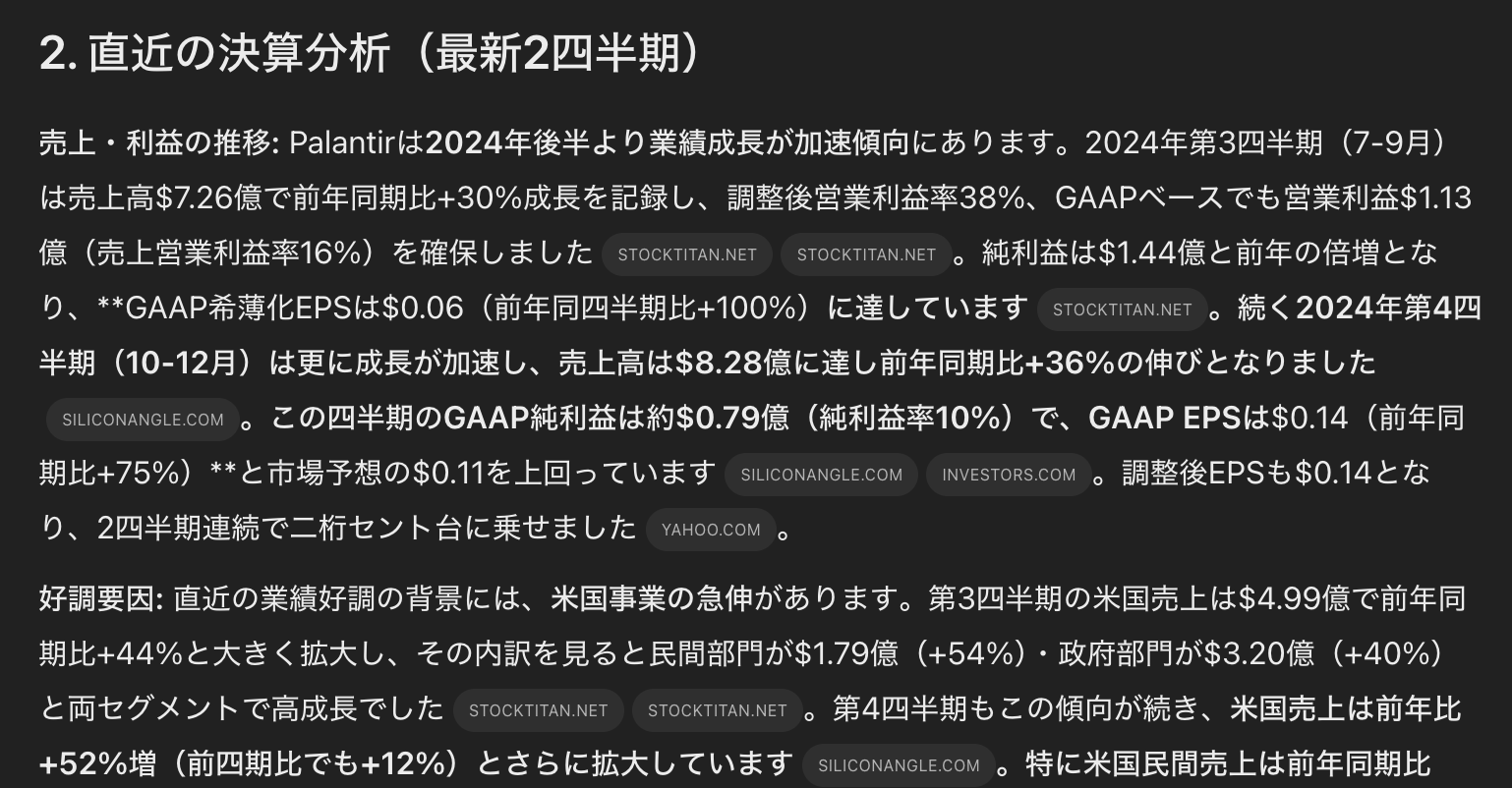 あなたはヘッジファンドのファンドマネージャーです。Palantirへの投資判断を行うため、総合的なリサーチを行い、レポートにまとめて下さい。レポートには以下の情報を含むが、投資判断に役立つ情報であればこれらに限定しない。