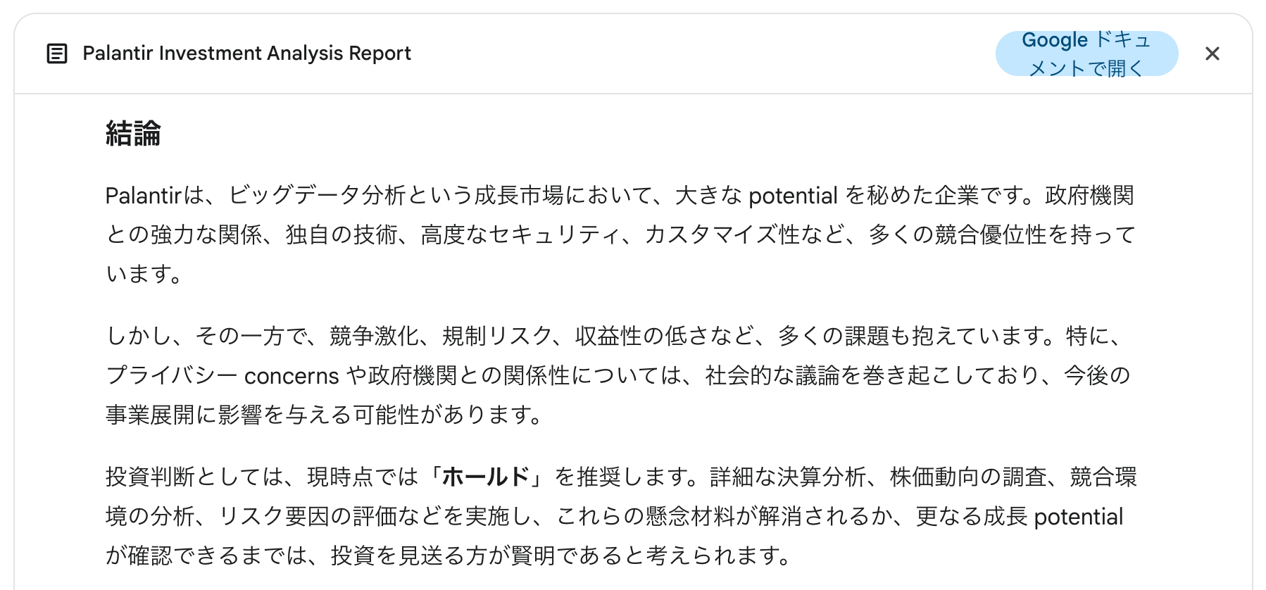 | 金融・経済 | Palantirへの投資判断 | サンプルレポート | サンプルレポート |
