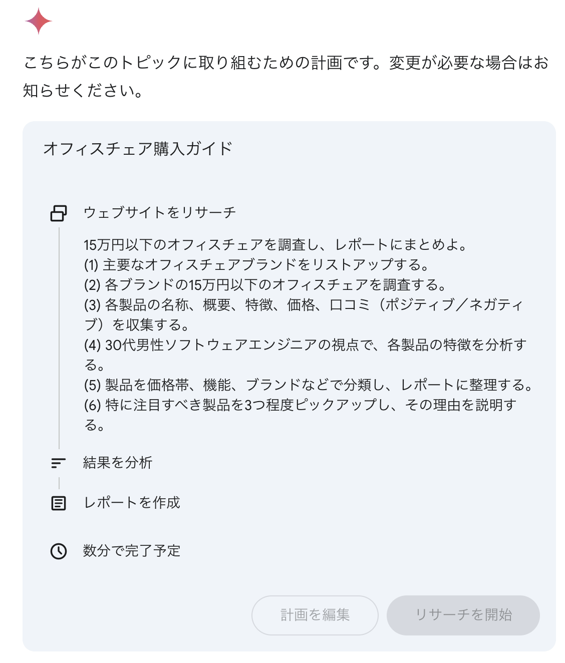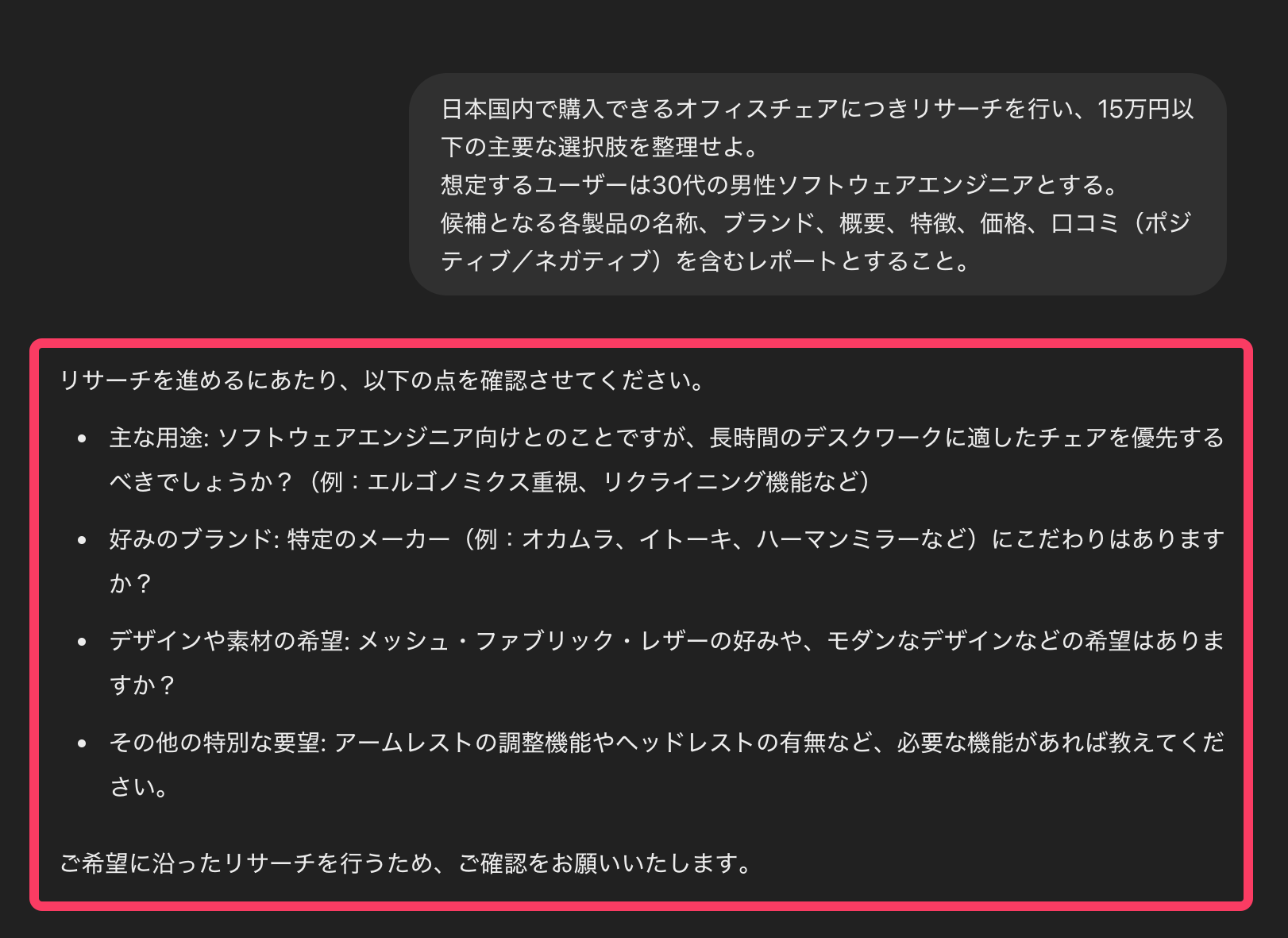 リサーチを開始する前に、以下のような確認の逆質問を行なってくる。