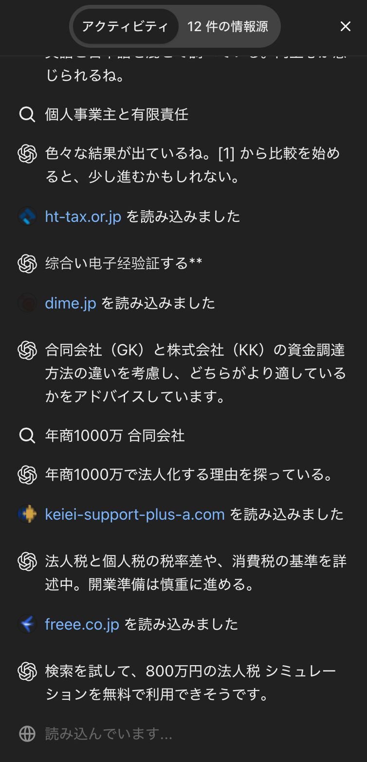 ChatGPTのDeep Research進行中に表示される「アクティビティ」タブを見ると、o3モデルが、検索を行って閲覧したページの情報を踏まえて、都度リサーチ計画を見直しながら、繰り返し検索を行っていく様子がわかる。