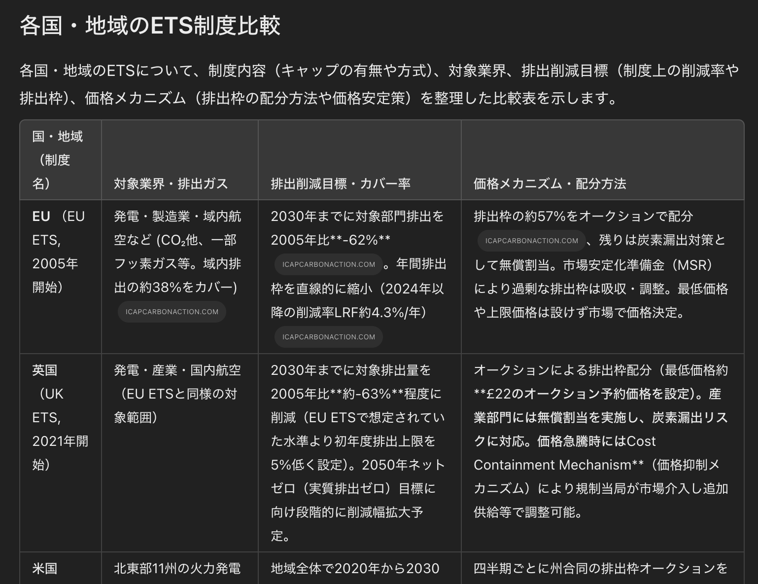 日本で導入される予定の「排出量取引制度」について理解するため、日本を含む先進諸国における制度概要を、表と文章を用いてレポートにまとめてください。特に、排出権取引制度に関連して新たなビジネスチャンス・収益機会を探索するため、すでに排出権取引制度が導入されている国や地域における関連企業・団体の事例にも触れてください。実際に生成されたレポートは、それぞれ以下の通りだ。ChatGPTの方が記述が充実してはいるが、投資レポートの例ほど、圧倒的な実力差はないようにも感じられる。