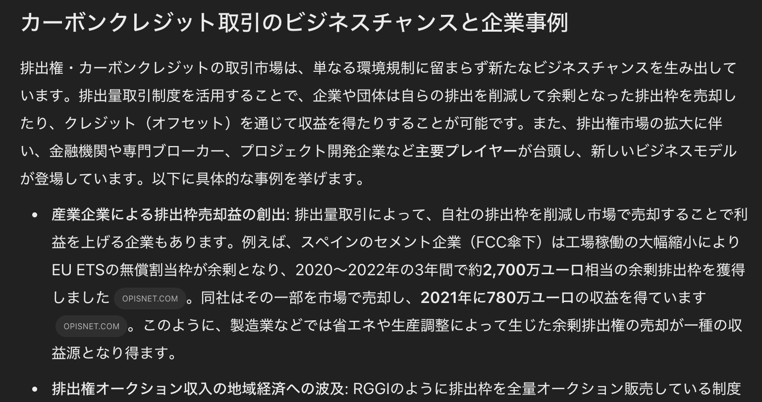 ただし、プロンプト後半で指示した「排出権取引制度に関連して新たなビジネスチャンス・収益機会を探索」という点への回答は、ChatGPTの方がより網羅的に検討し、かつ事例も多数集めてきてくれている(以下画像)。