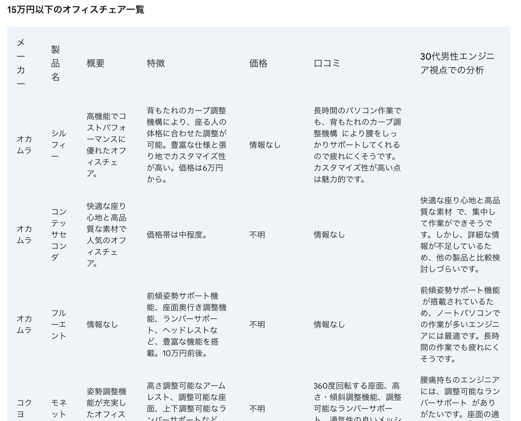 日本国内で購入できるオフィスチェアにつきリサーチを行い、15万円以下の主要な選択肢を整理せよ。想定するユーザーは30代の男性ソフトウェアエンジニアとする。候補となる各製品の名称、ブランド、概要、特徴、価格、口コミ(ポジティブ/ネガティブ)を含むレポートとすること。ChatGPTとGeminiのそれぞれによって生成されたレポートは以下である。