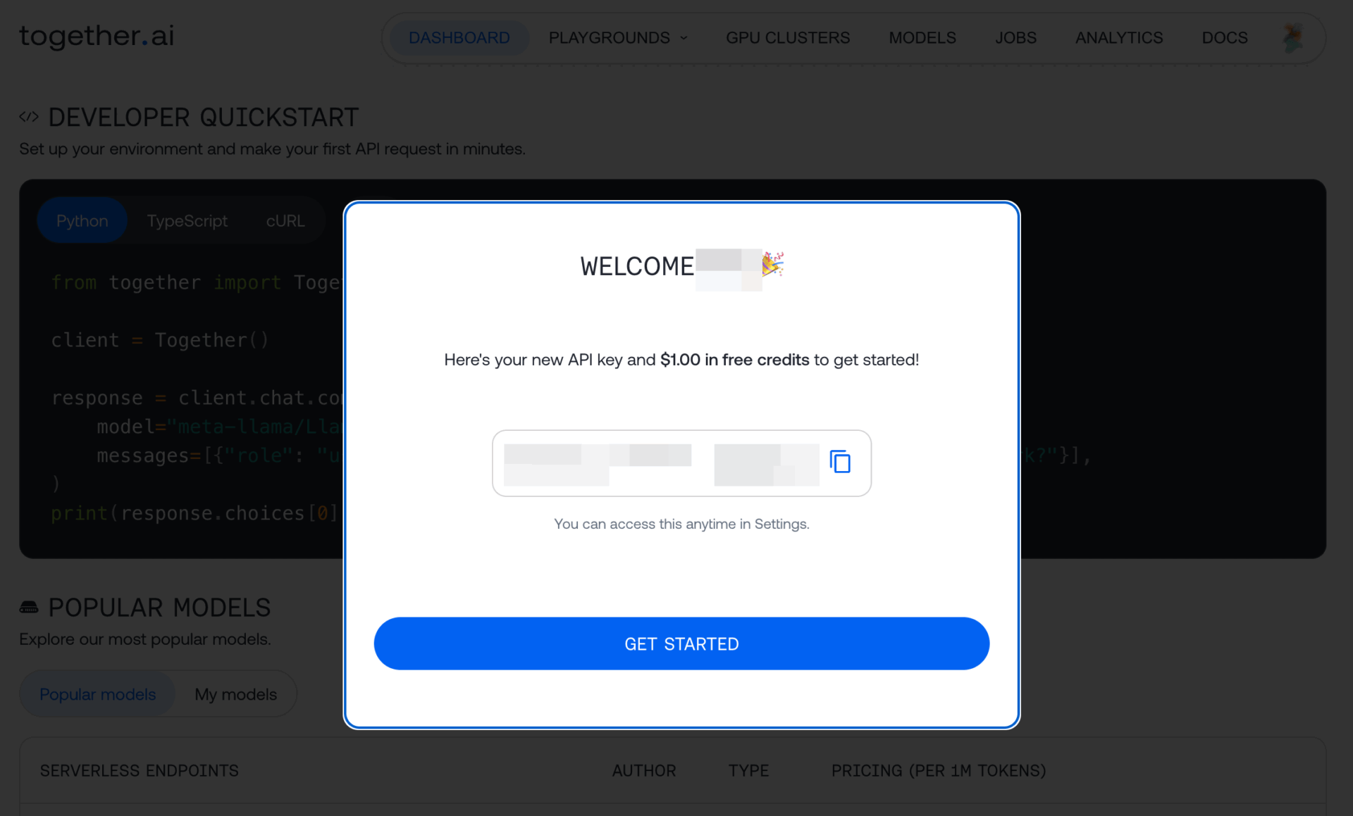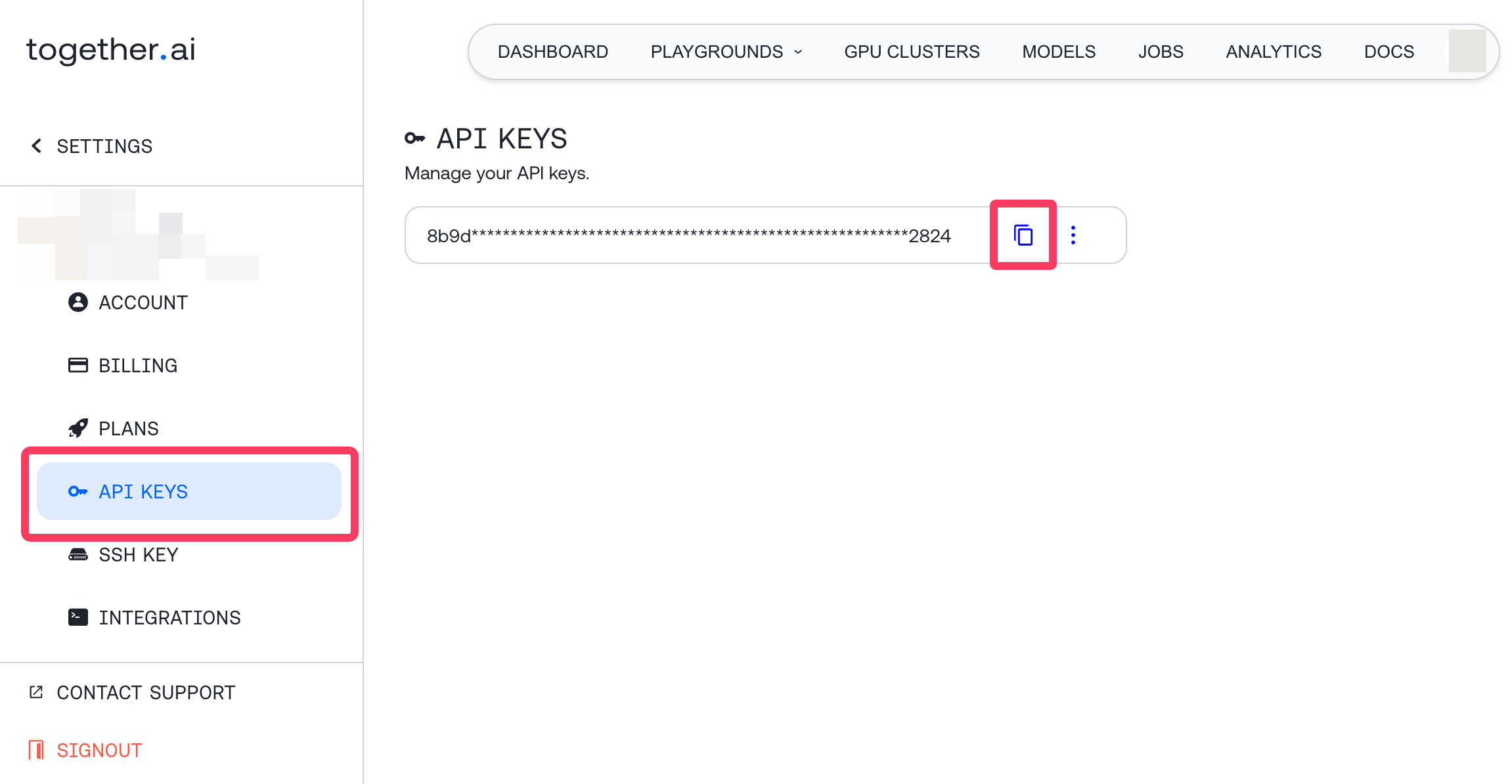 APIキーは、Together AIのダッシュボードからAPI KEYSのページに進むとコピーできる。