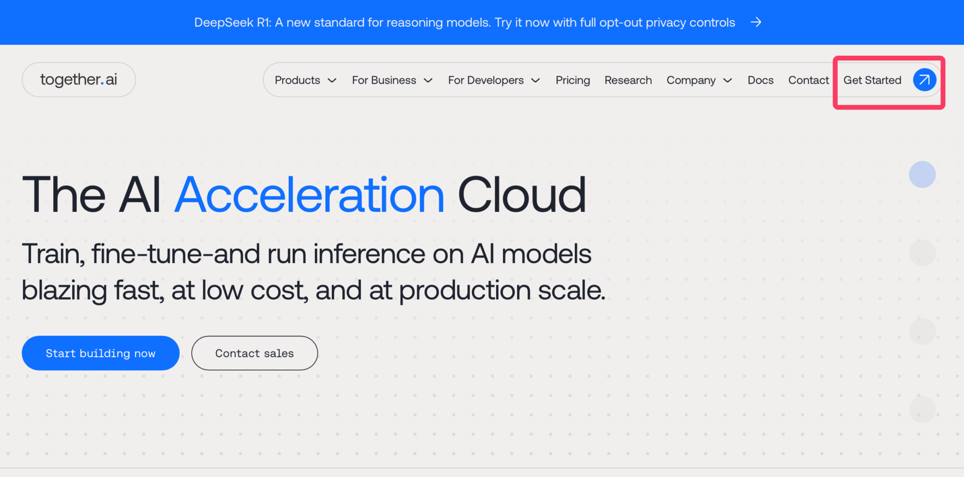 記事執筆現在、Together AI自身が、トップページで「DeepSeek R1使えるよ!プライバシーコントロール可能だよ!」とアピールしている。DeepSeek R1のプライバシー懸念が注目を集める中で、おそらくユーザーが増えているのだろう。