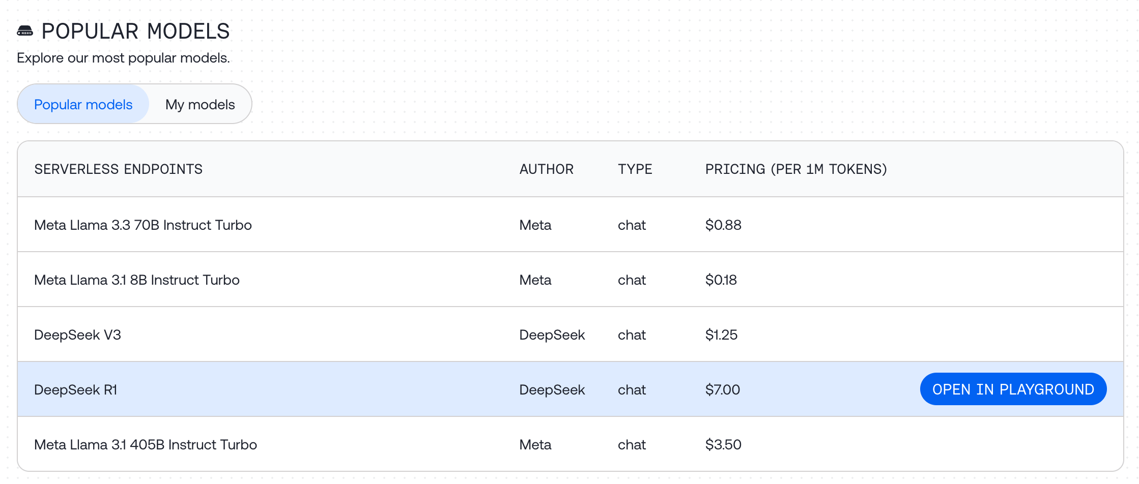 DeepSeek R1 にカーソルを合わせると、「OPEN IN PLAYGROUND」というボタンが現れるので、これをクリックしてみる。
