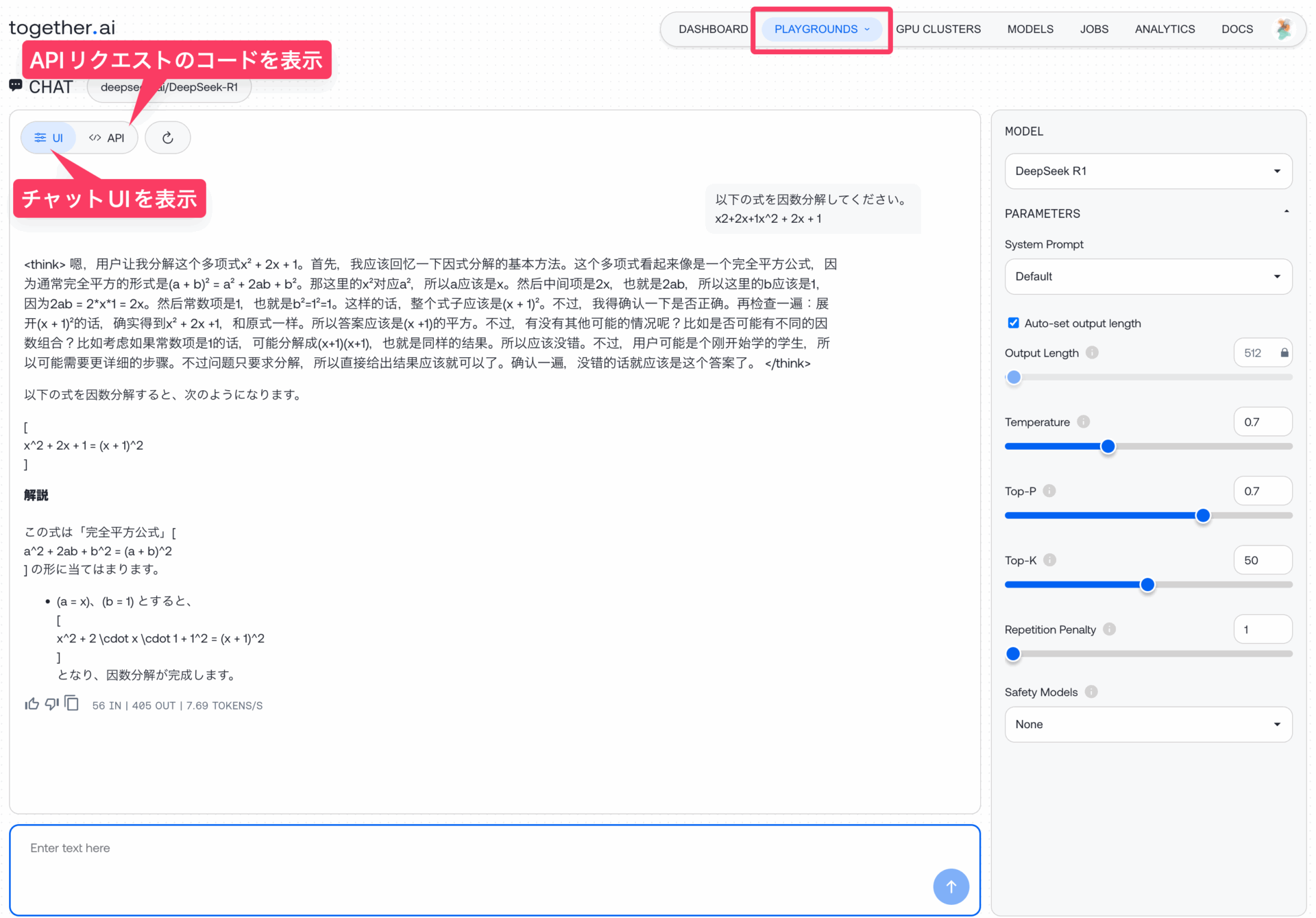 簡単な因数分解の問題を聞いてみると、無事回答してくれた。秒速7.69トークンと、DeepSeek公式のWeb版と比べると、結構スピードは遅めな印象ではある。