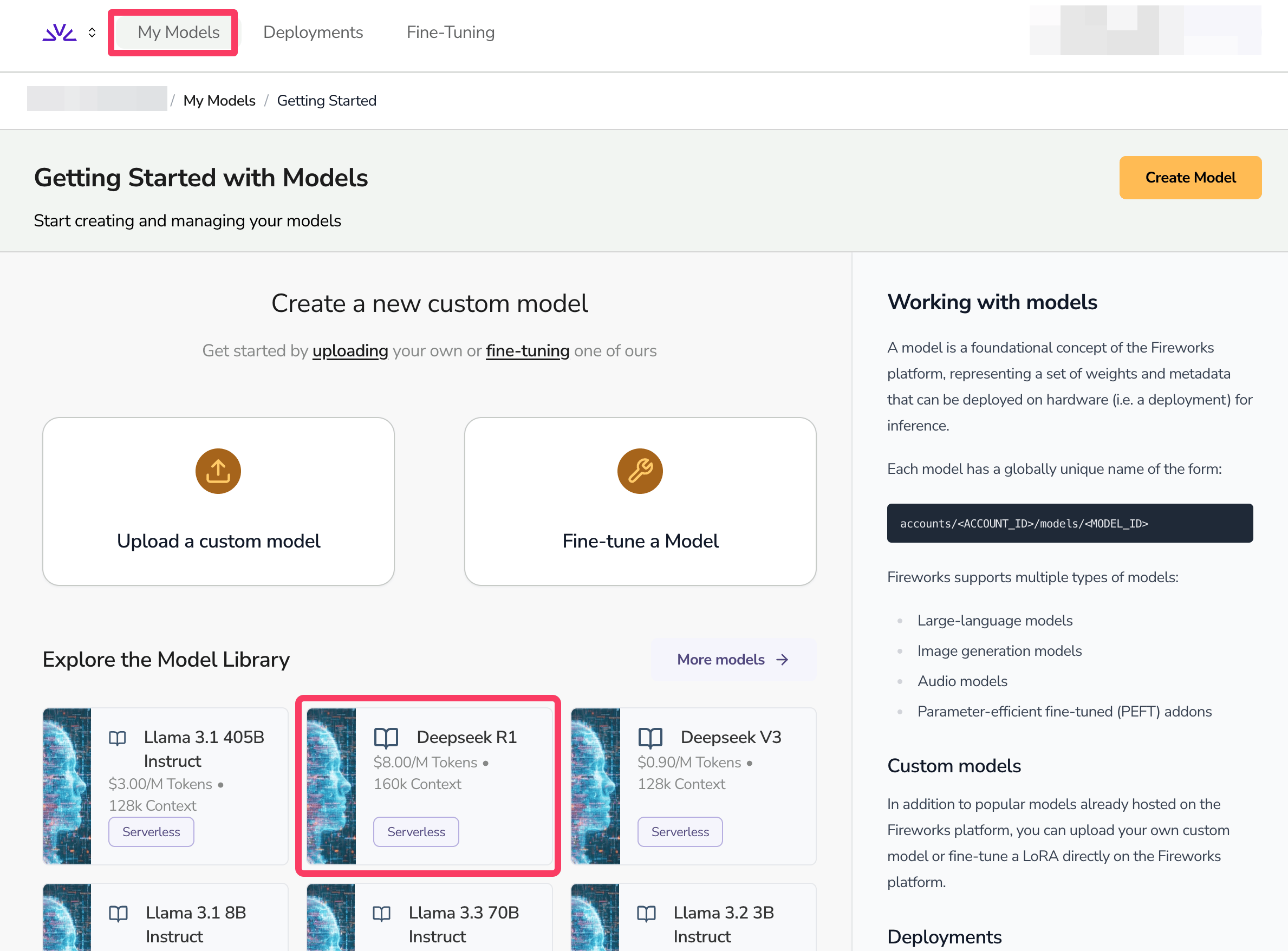 自分で大規模言語モデルをアップロードしたり、既存のモデルをファインチューニングしたりするオプションもあるが、ここでは「Explore the Model Library」からDeepSeek R1を指定する。