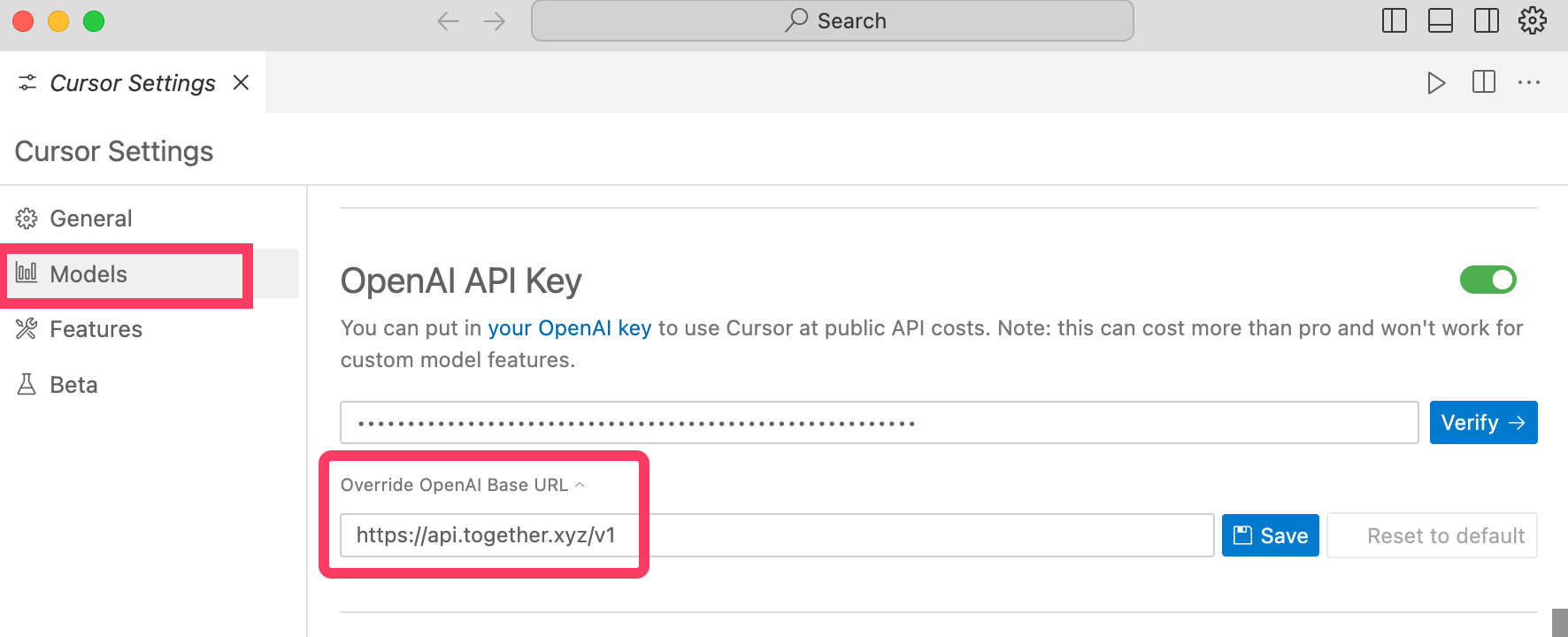 Cursor Settings > Models > OpenAI API Key > Override OpenAI Base URLで、Base URLを上書きできる。
