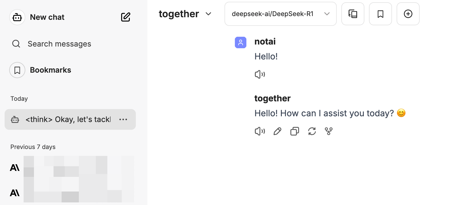 Base URLをTogether AIのものに変更して、モデルにdeepseek-ai/DeepSeek-R1を足せば、Together AIのAPI経由のR1を利用できるはずだ。